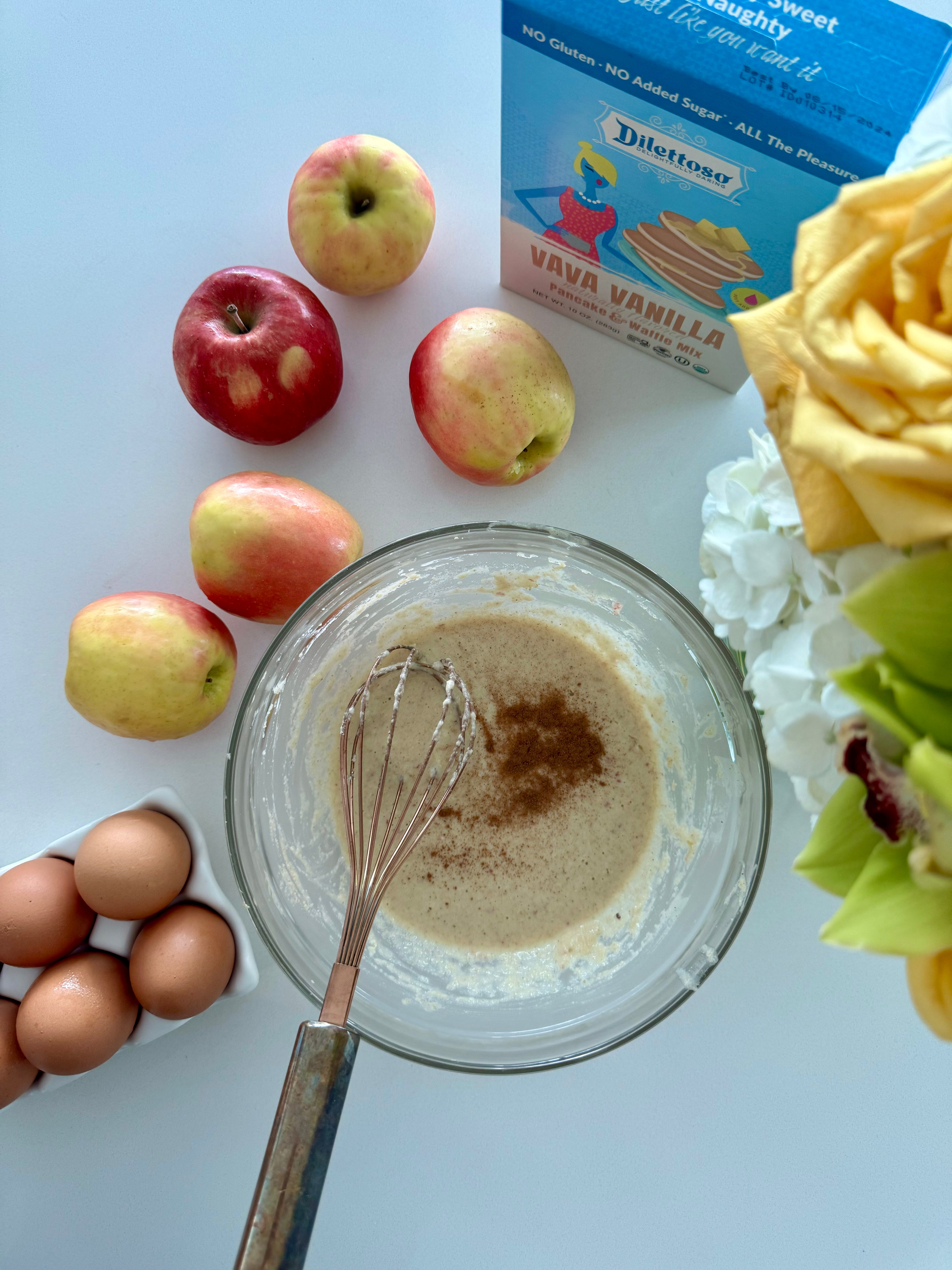 - PLACE the Vava Vanilla Dilettoso mix, cinnamon, ginger, shredded apple, egg, and milk in a large bowl. Use a whisk to mix until combined. Don’t over-mix – a few lumps are fine. Let the batter sit for 5 minutes.