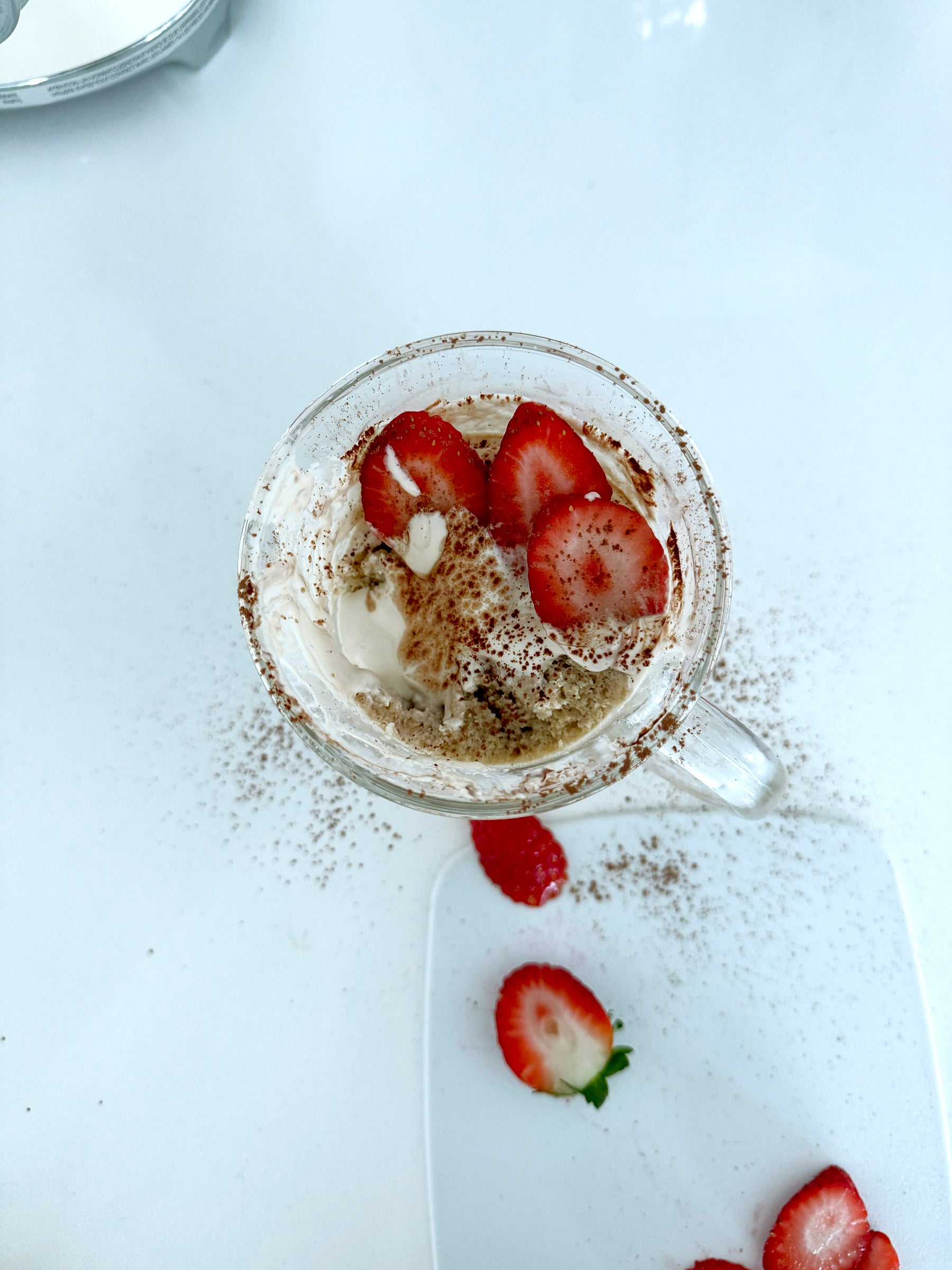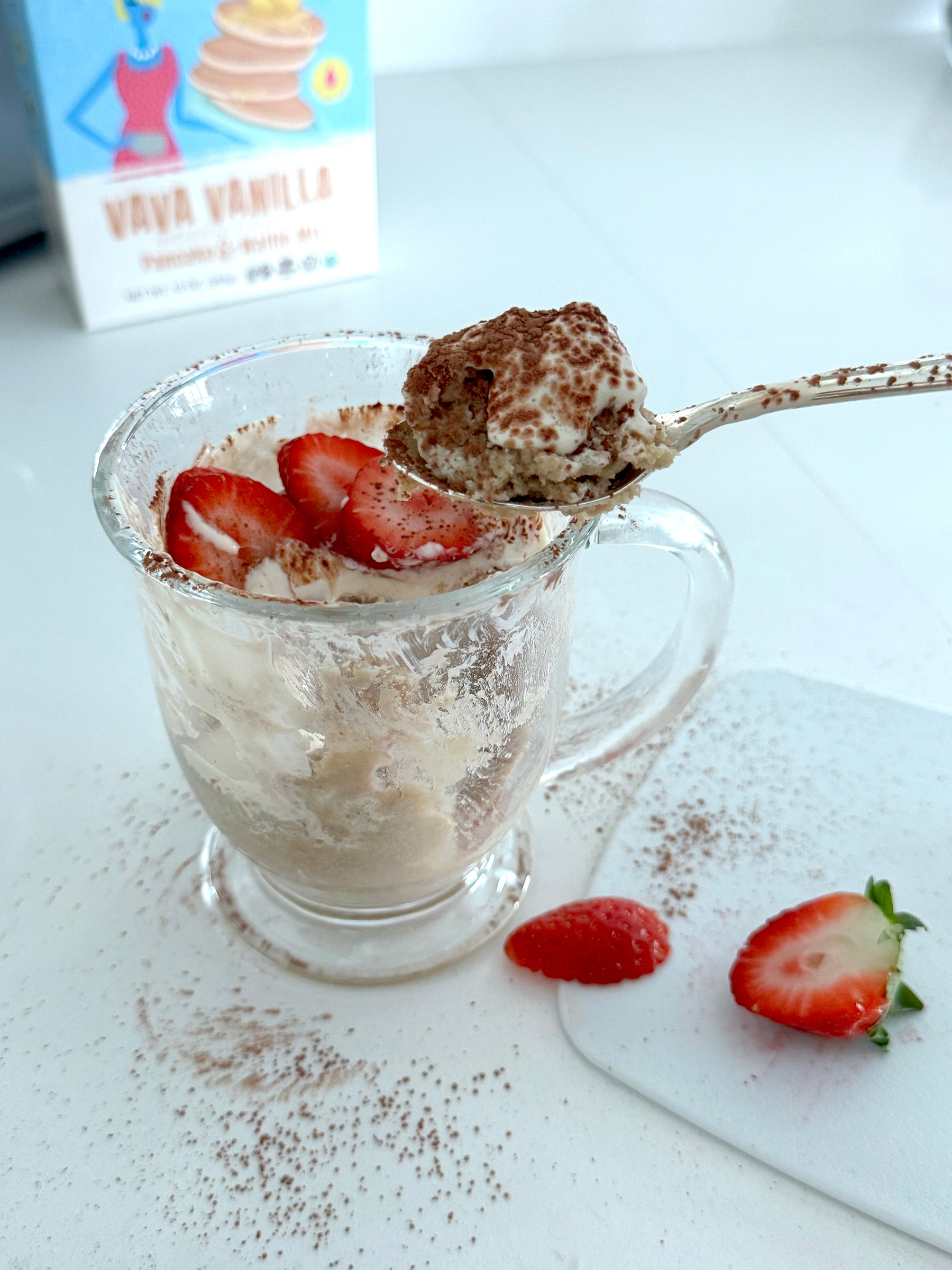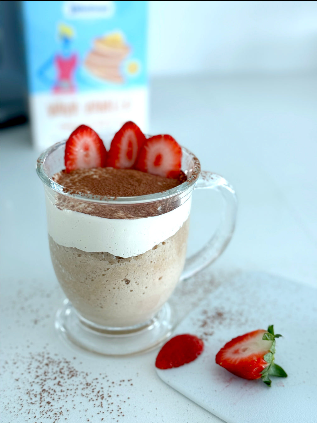- TOP your cappuccino mug cake with the coffee cream, add some fresh strawberries and dust it with cacao powder.