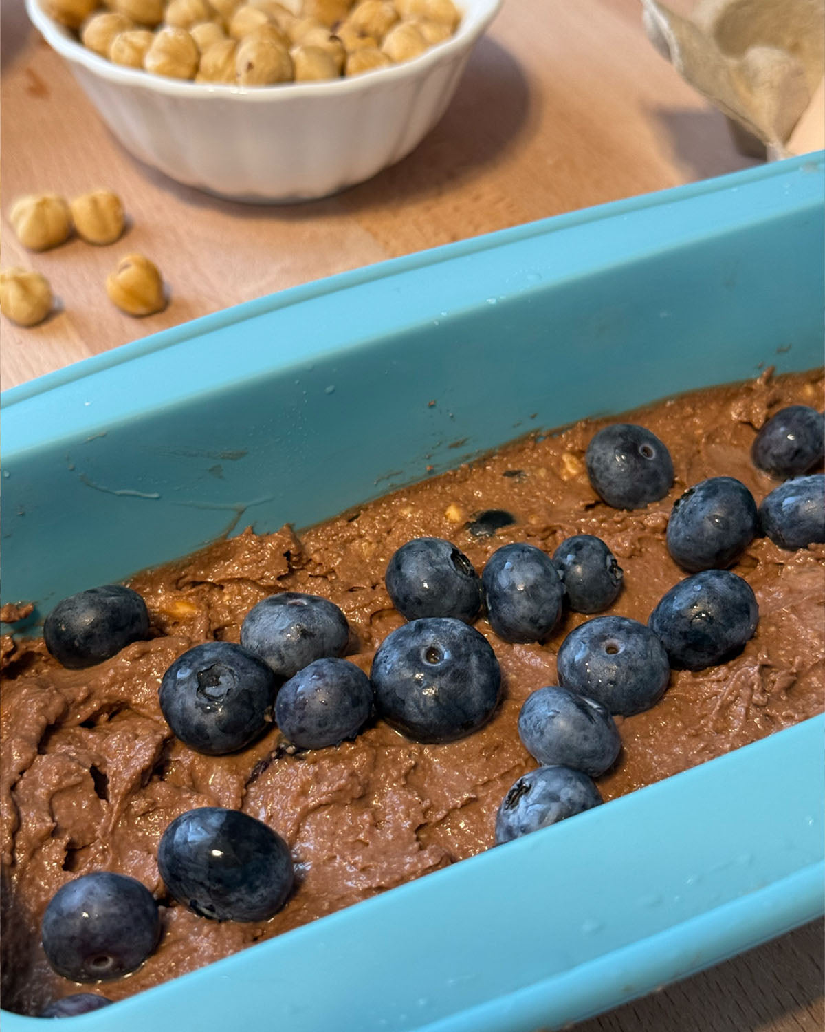 - POUR batter into prepared pan, TOP with remaining blueberries and an extra sprinkle of hazelnuts.
