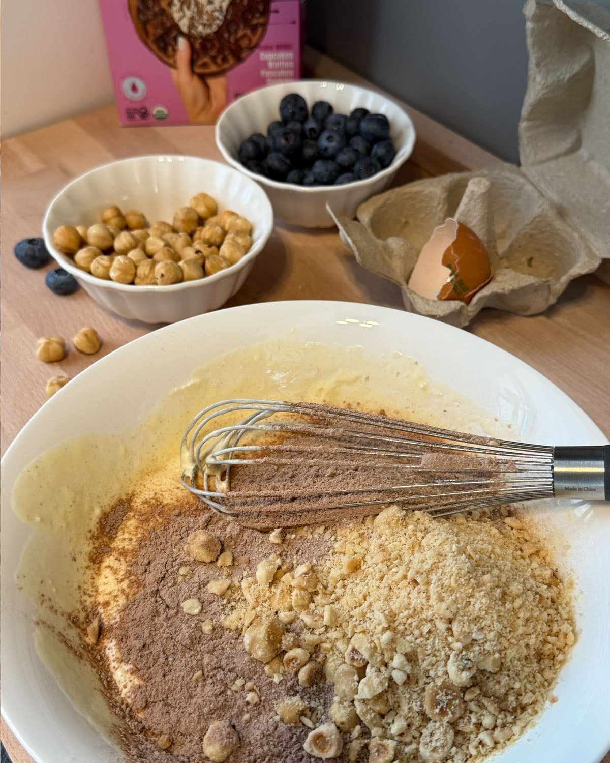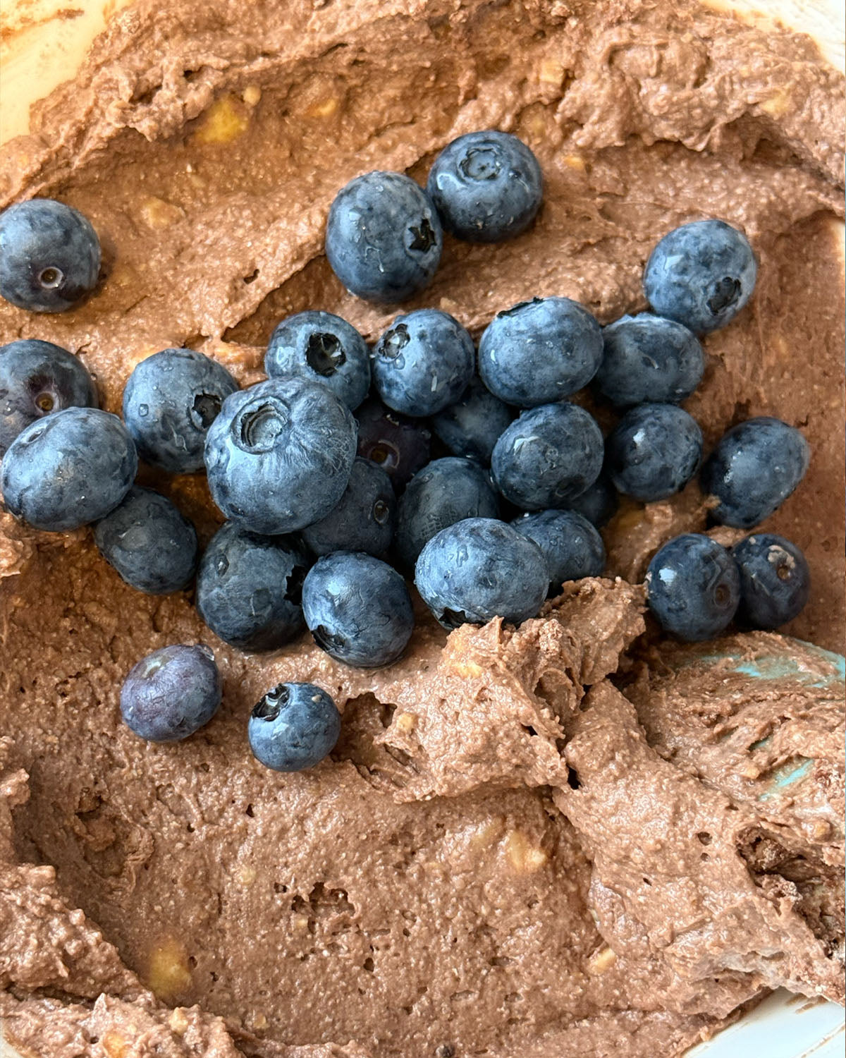 - FOLD in crushed hazelnuts and most of the blueberries (reserve a few for topping).