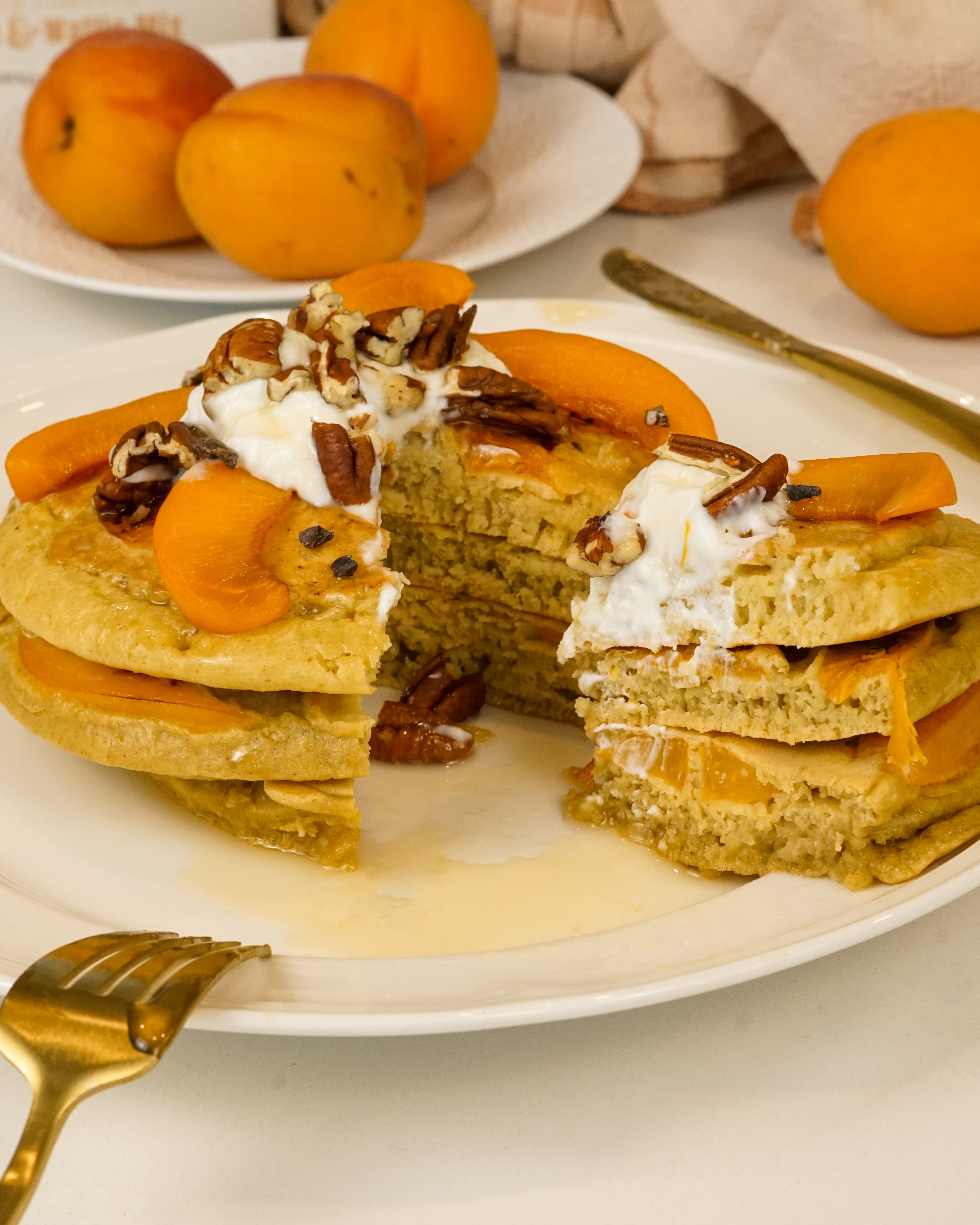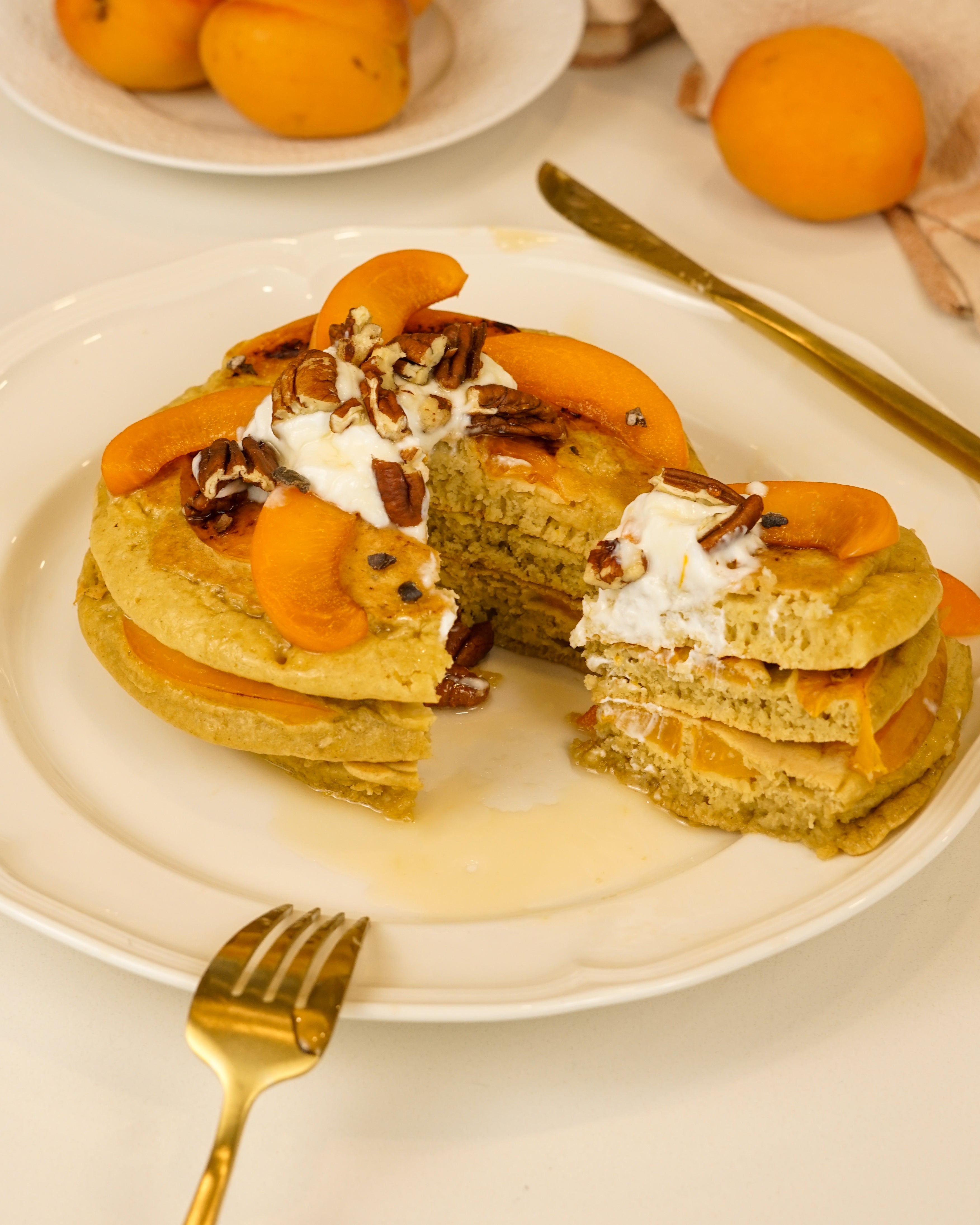 - TOP your protein pancakes with a tablespoon of Greek yogurt, extra apricots, a generous drizzle of maple syrup or honey, and a few chopped pecans.