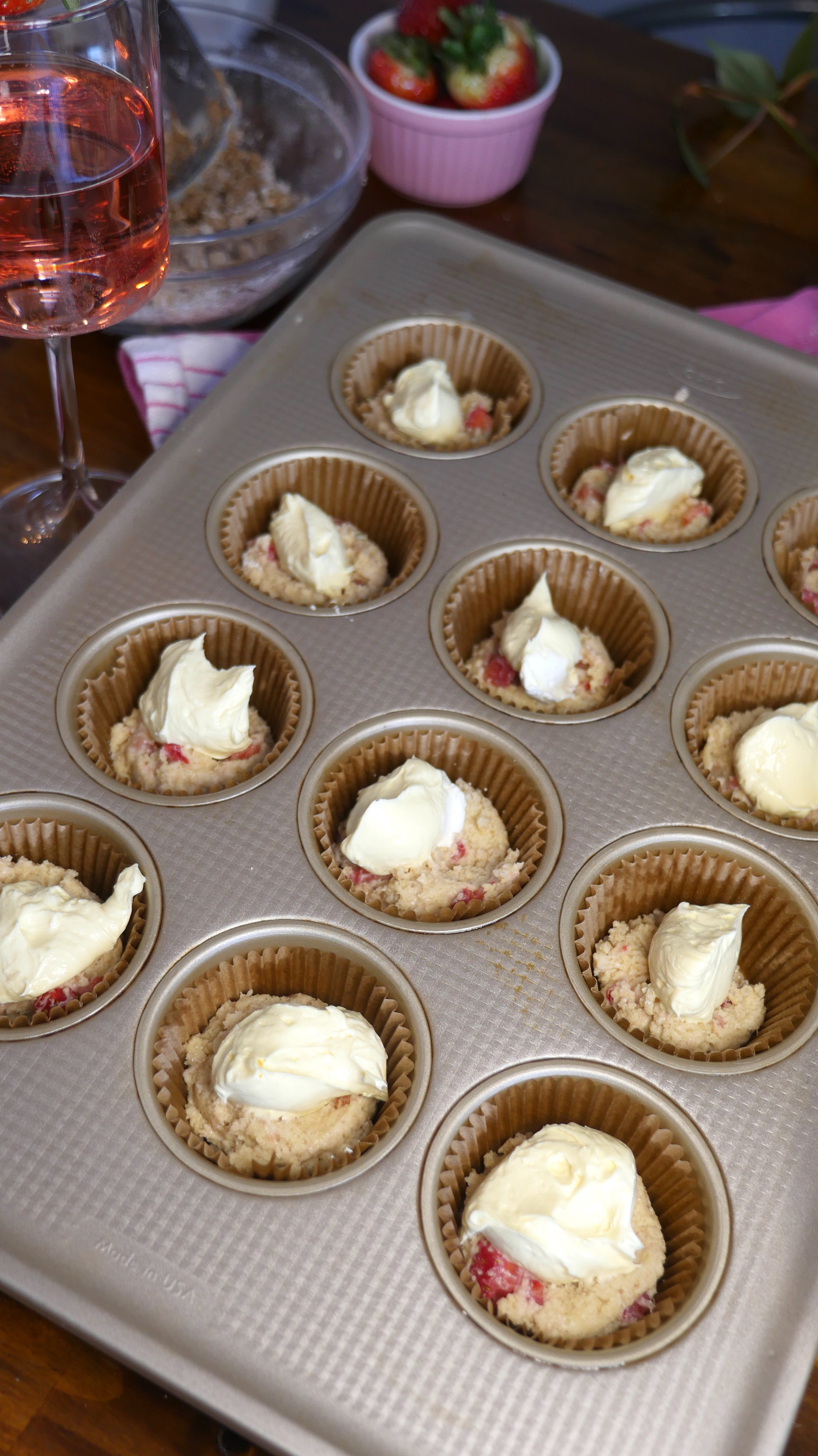 - USE an ice-cream scoop to scoop the muffin batter into the muffin liner so that they are about 1/3 of the way filled. Spoon about 1 tablespoon of the cream cheese on top and then cover with remaining batter (it's ok if the batter doesn't completely cover the cream cheese batter).