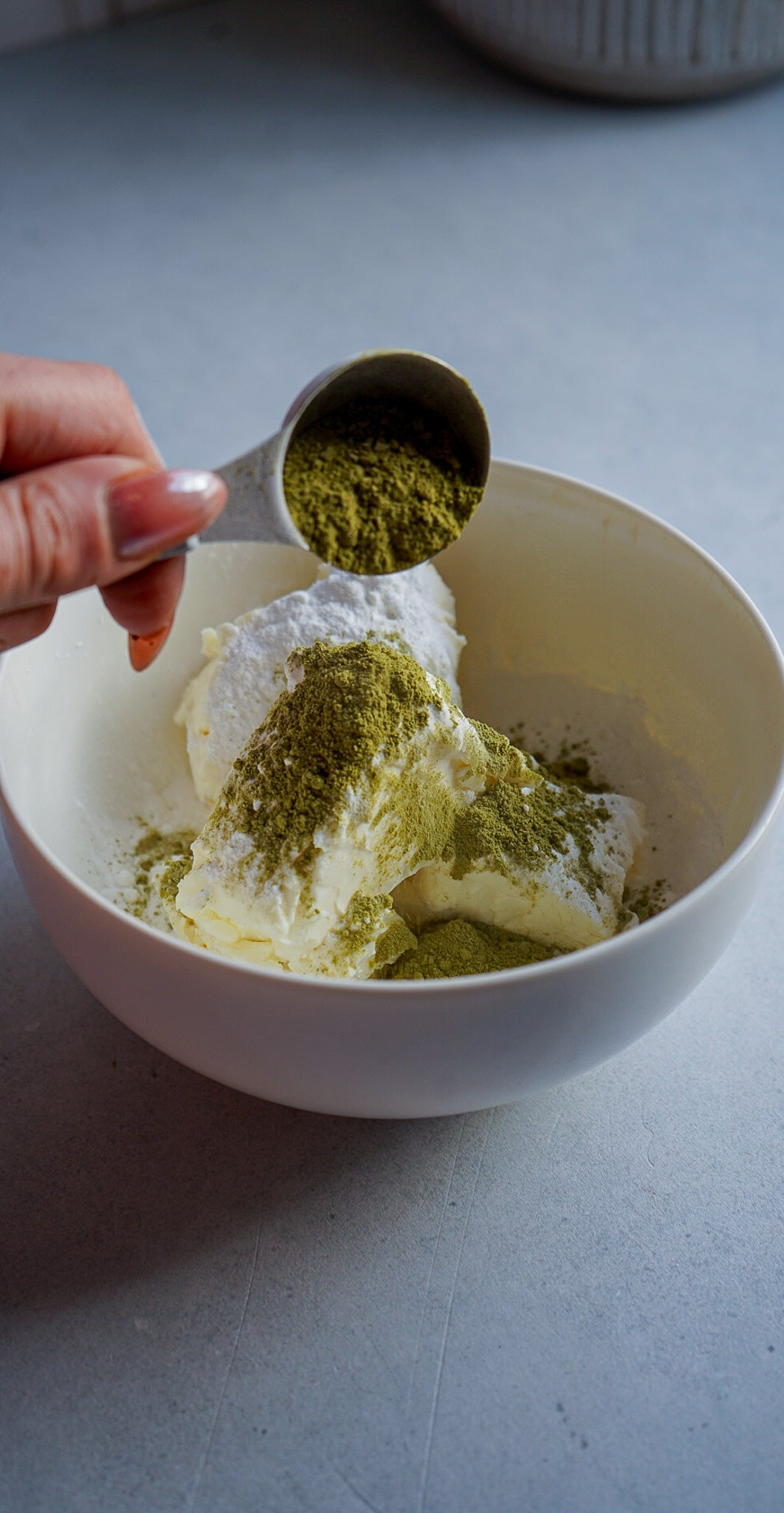 - Prepare Filling: Beat cream cheese, powdered monk fruit, matcha powder, and vanilla extract until smooth.