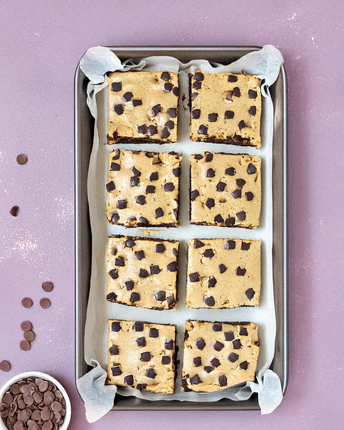 - BAKE: Spread the batter evenly into the prepared pan, then sprinkle remaining chocolate chips on top. Bake for 18-22 minutes or until the edges are golden and a toothpick inserted in the center comes out with a few moist crumbs.