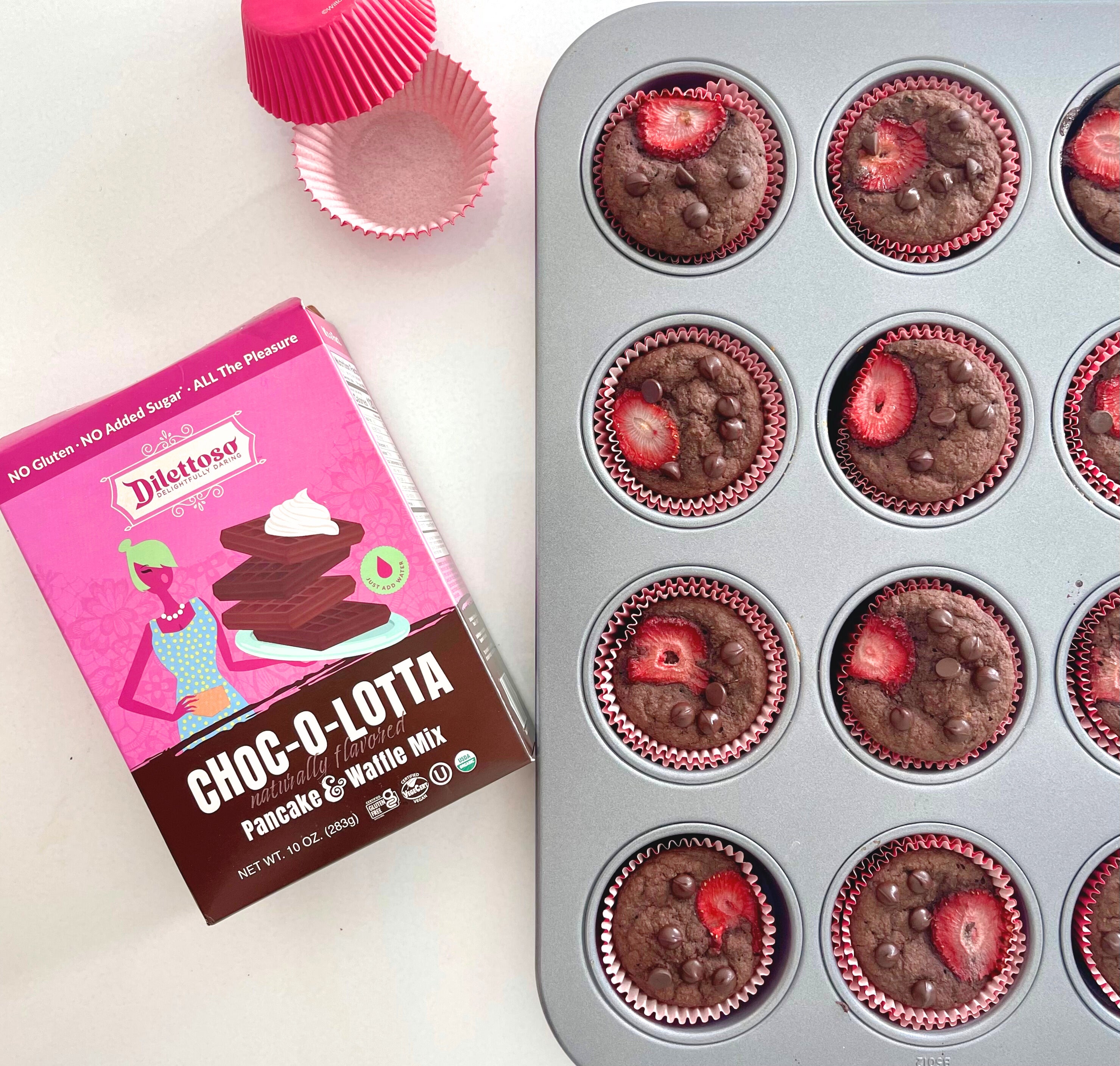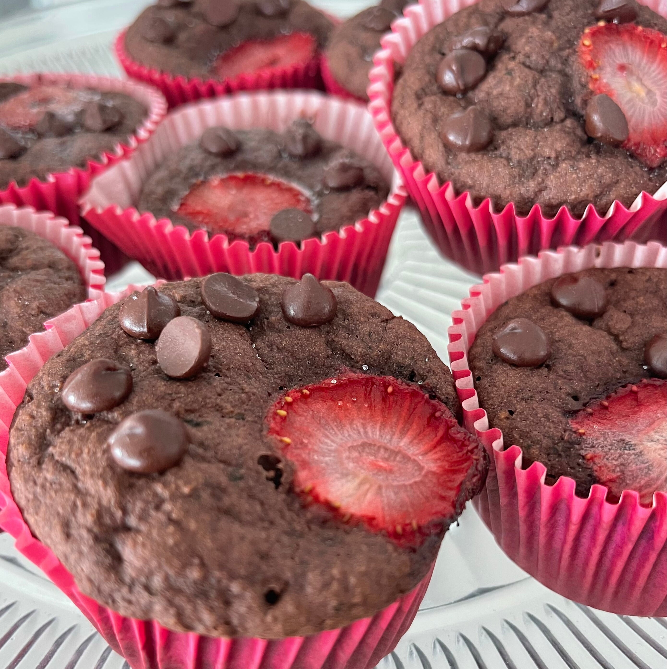 - FILL ⅔ of each muffin liner with the batter, sprinkle with more chocolate chips and top with a thin strawberry slice.