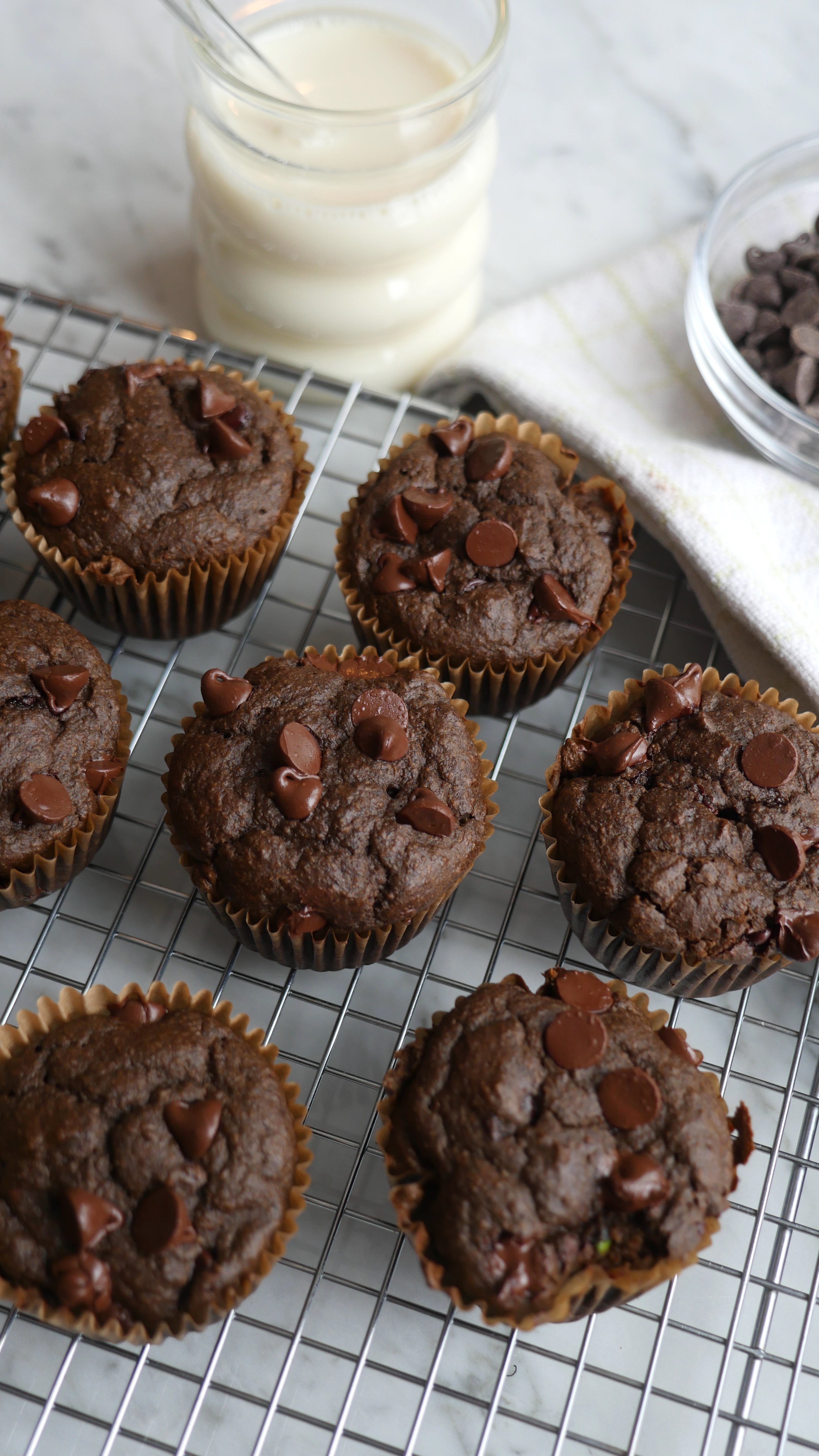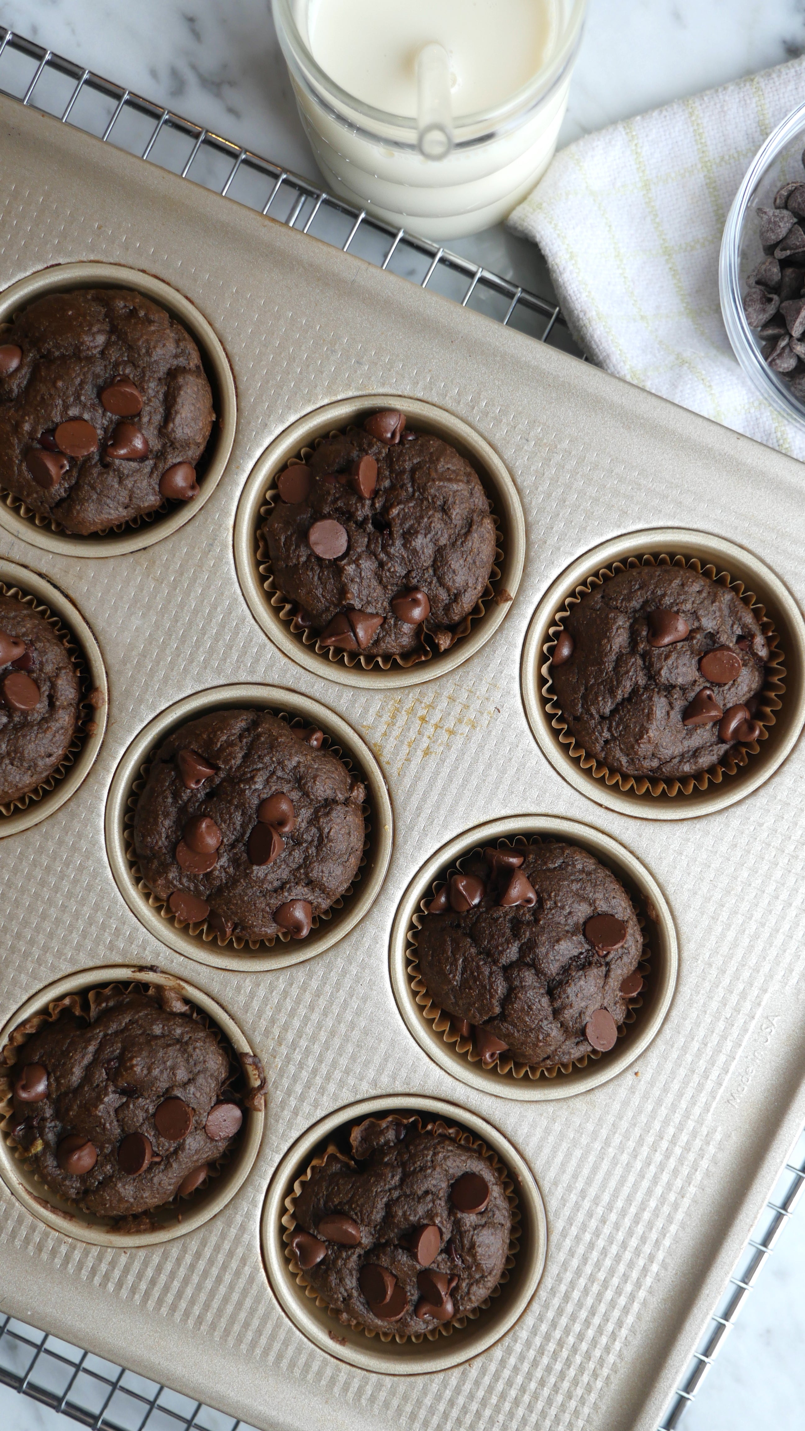- DISTRIBUTE the batter in the prepared muffin tin, until each cup is 3/4 full. Top with more chocolate chips.