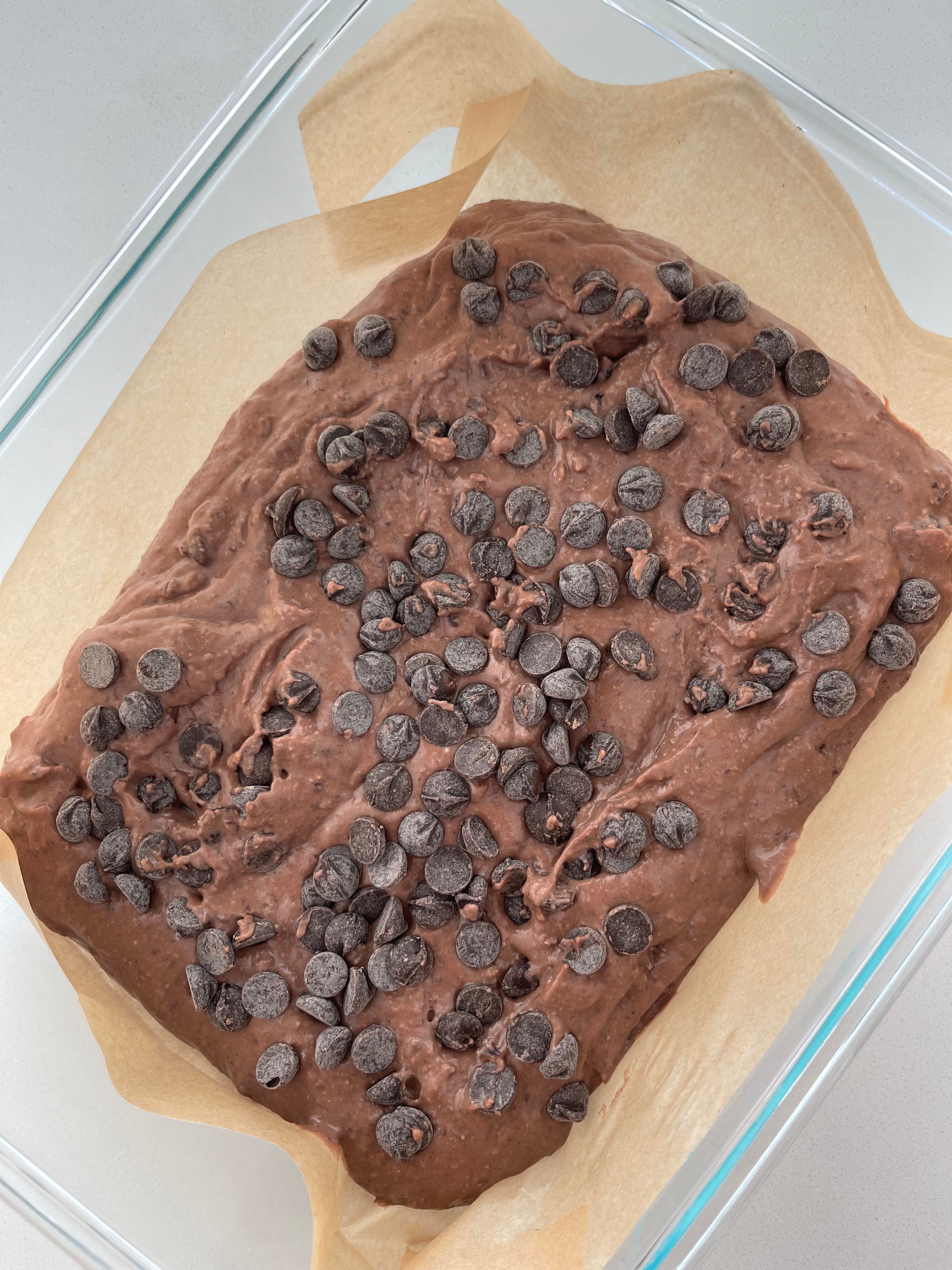 - TRANSFER batter to your parchment-lined baking dish and spread into an even layer using a spoon or rubber spatula. Top with chocolate chips and pecans (or walnuts).