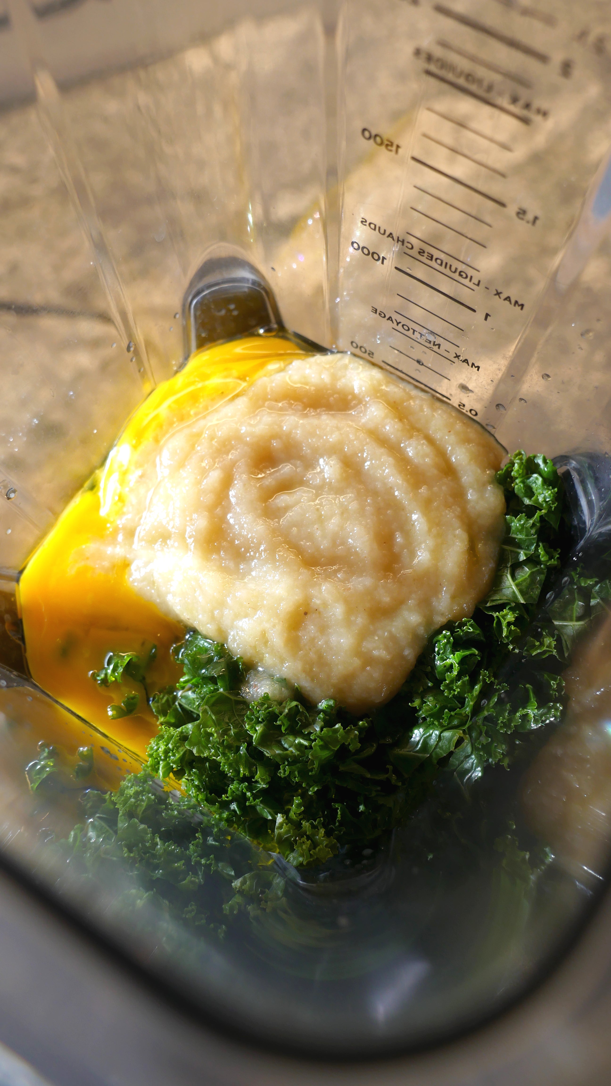 - ADD the kale to a blender (or a large bowl and use a stick blender) with the eggs, oil, vanilla, applesauce and whiz until smooth.