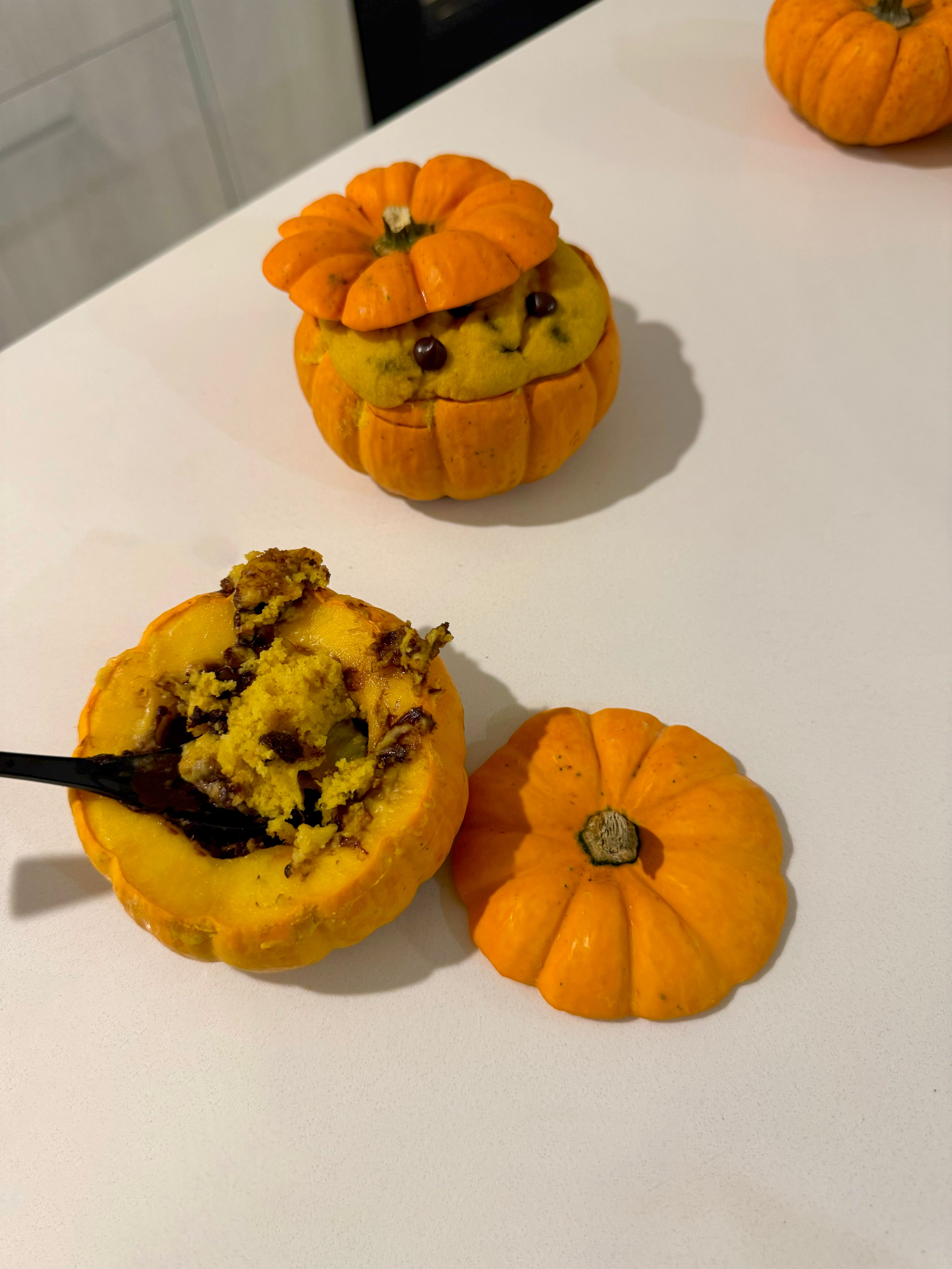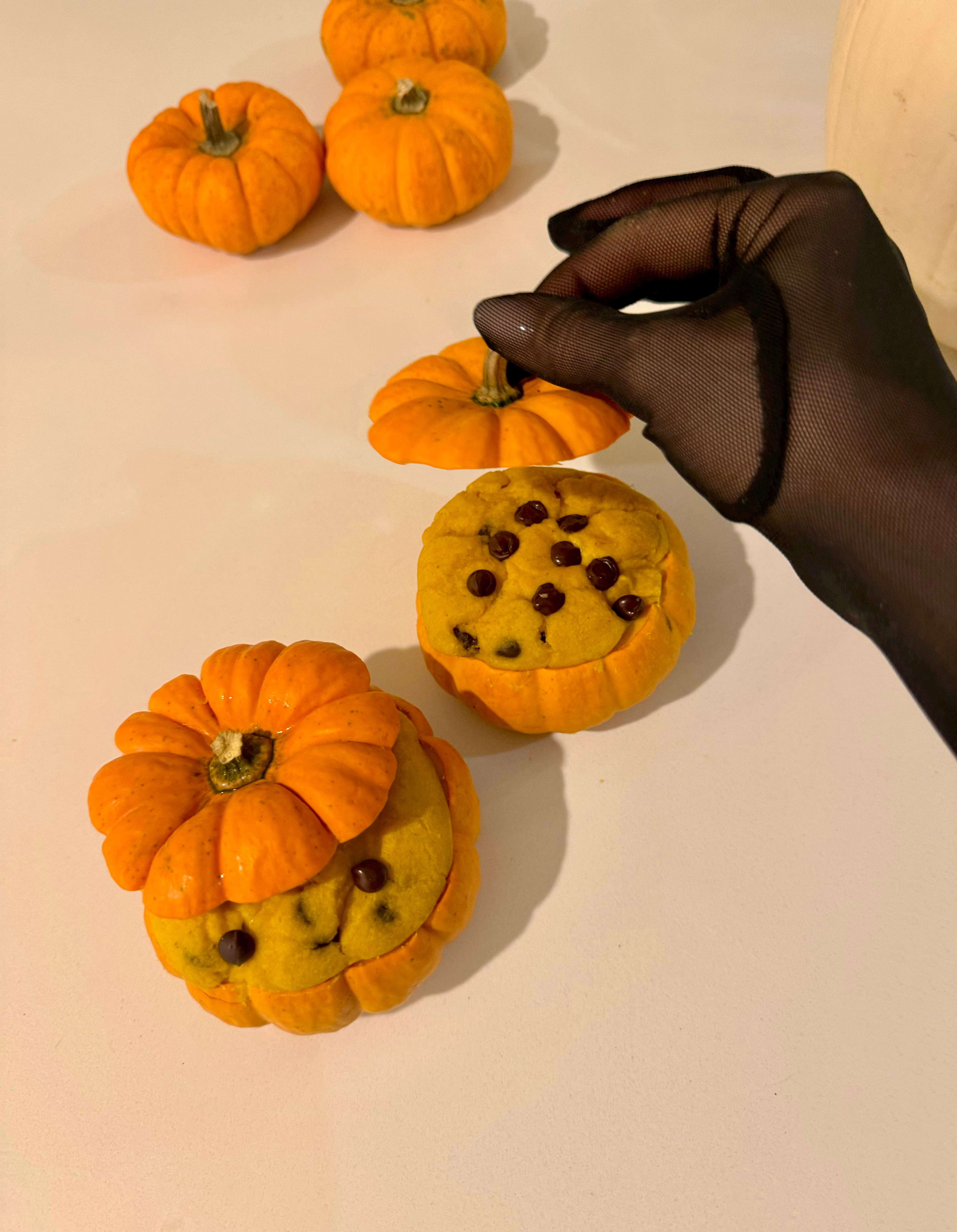 - POUR the batter into the pumpkin cups and bake without the pumpkin "lid".