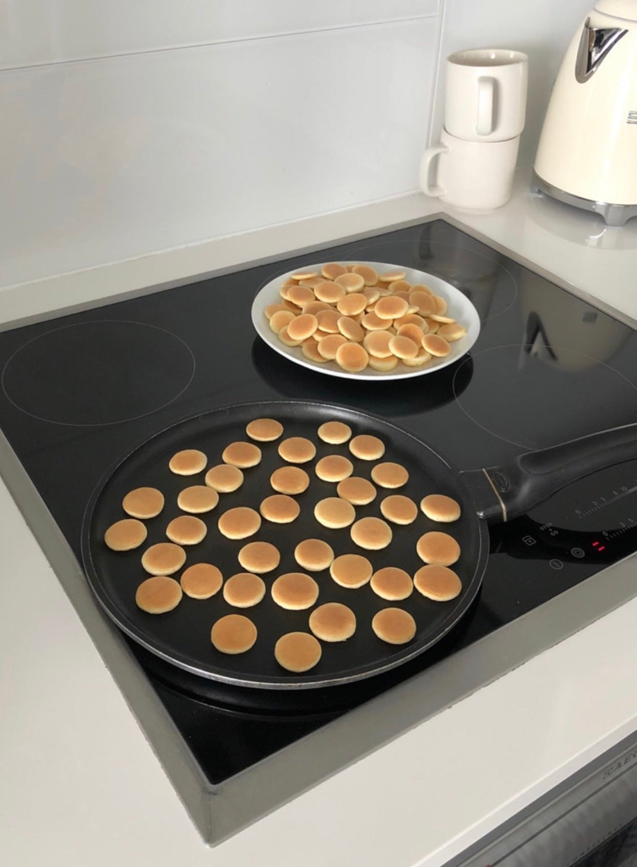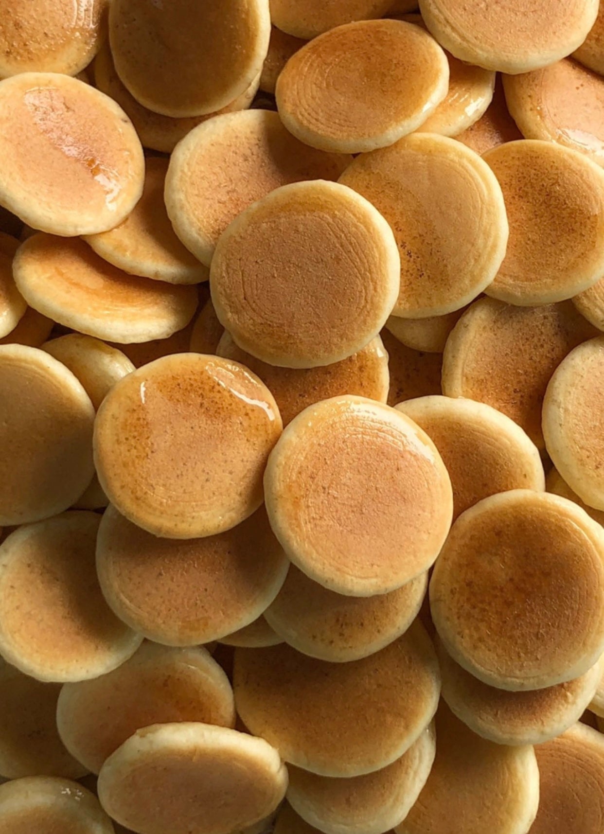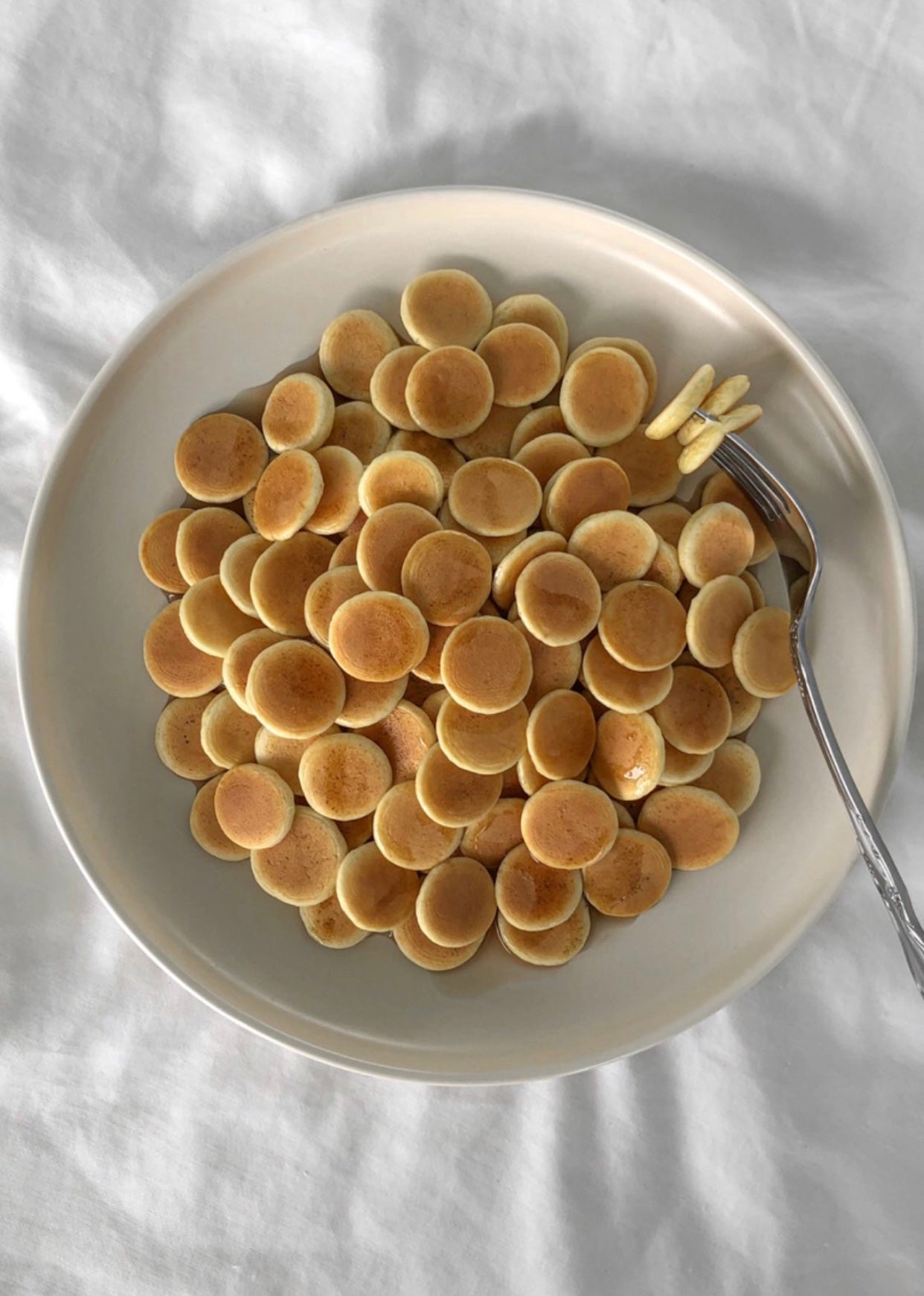 - FLIP the mini pancakes over after 30 seconds and let them cook on the other side until golden, before transferring them to a plate.