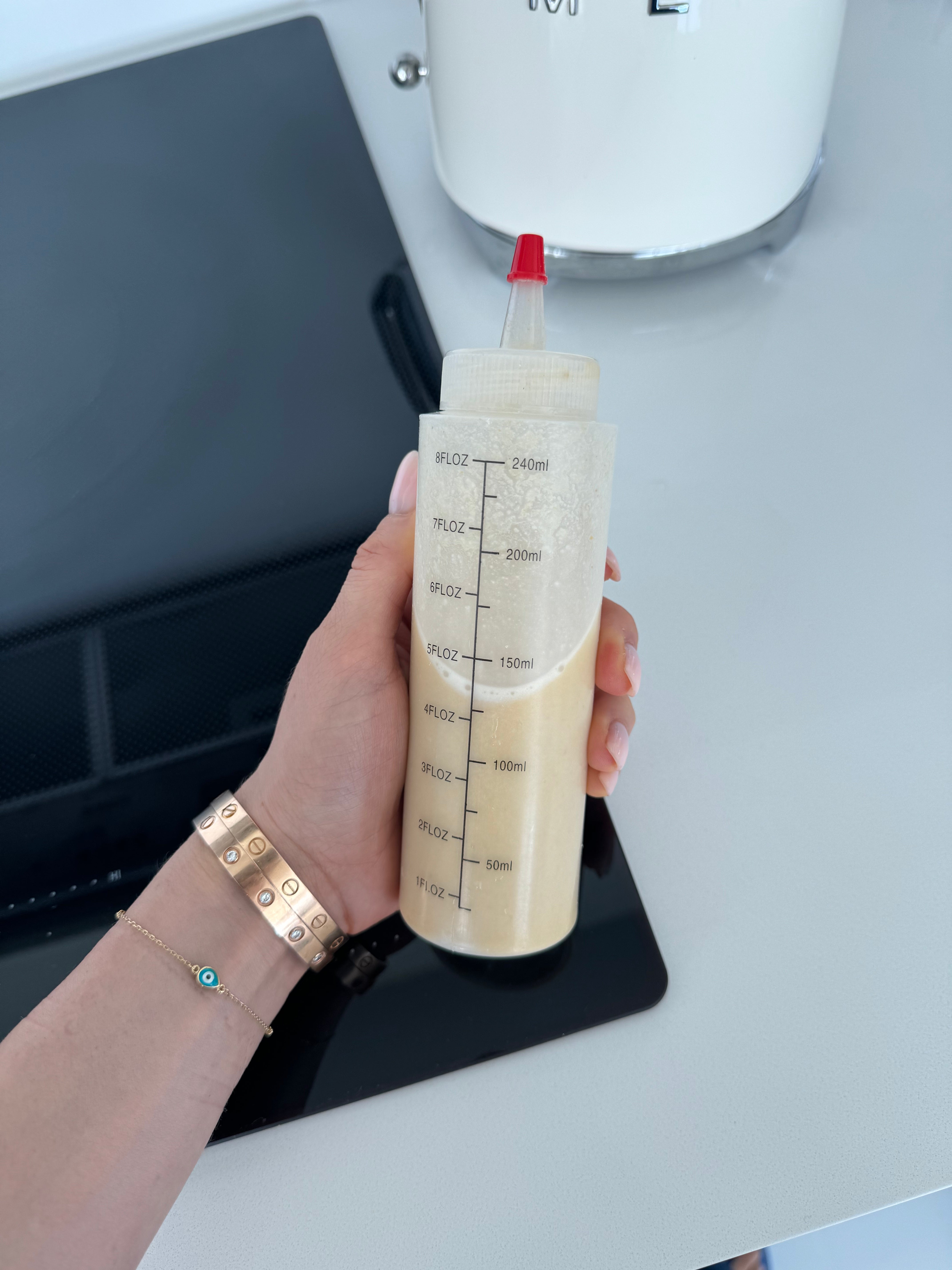 - TRANSFER the batter into a squeeze bottle (see photos and our Amazon link), then squeeze the bottle and pour your yummy mix into the pan, making mini round pancakes.