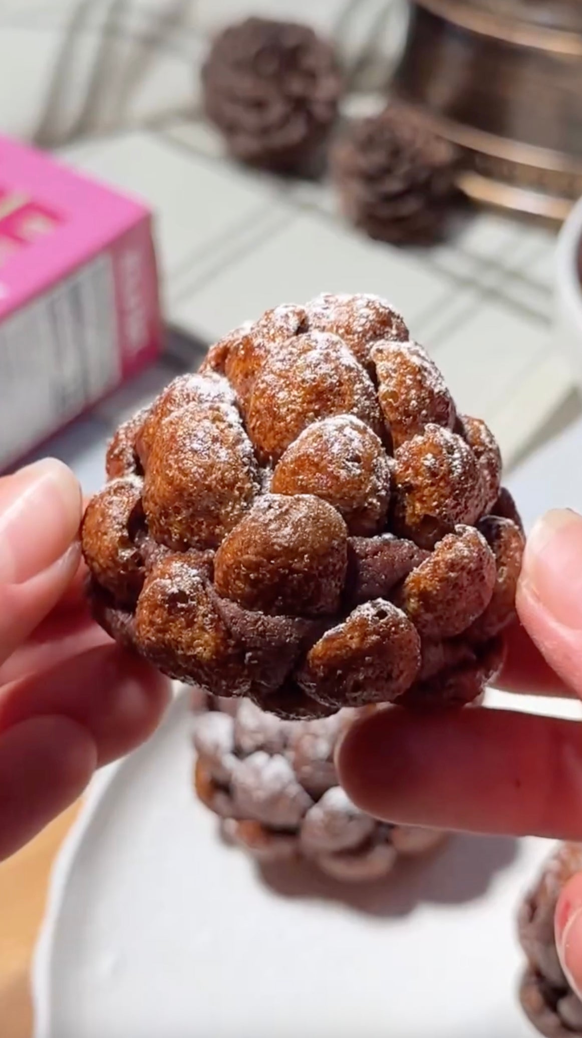 Rich chocolate truffles shaped like pinecones, with a nutty base and a crunchy cornflake finish. A dusting of powdered sugar adds a snowy touch, making these treats perfect for festive snacking, gifting, or warm winter moments.