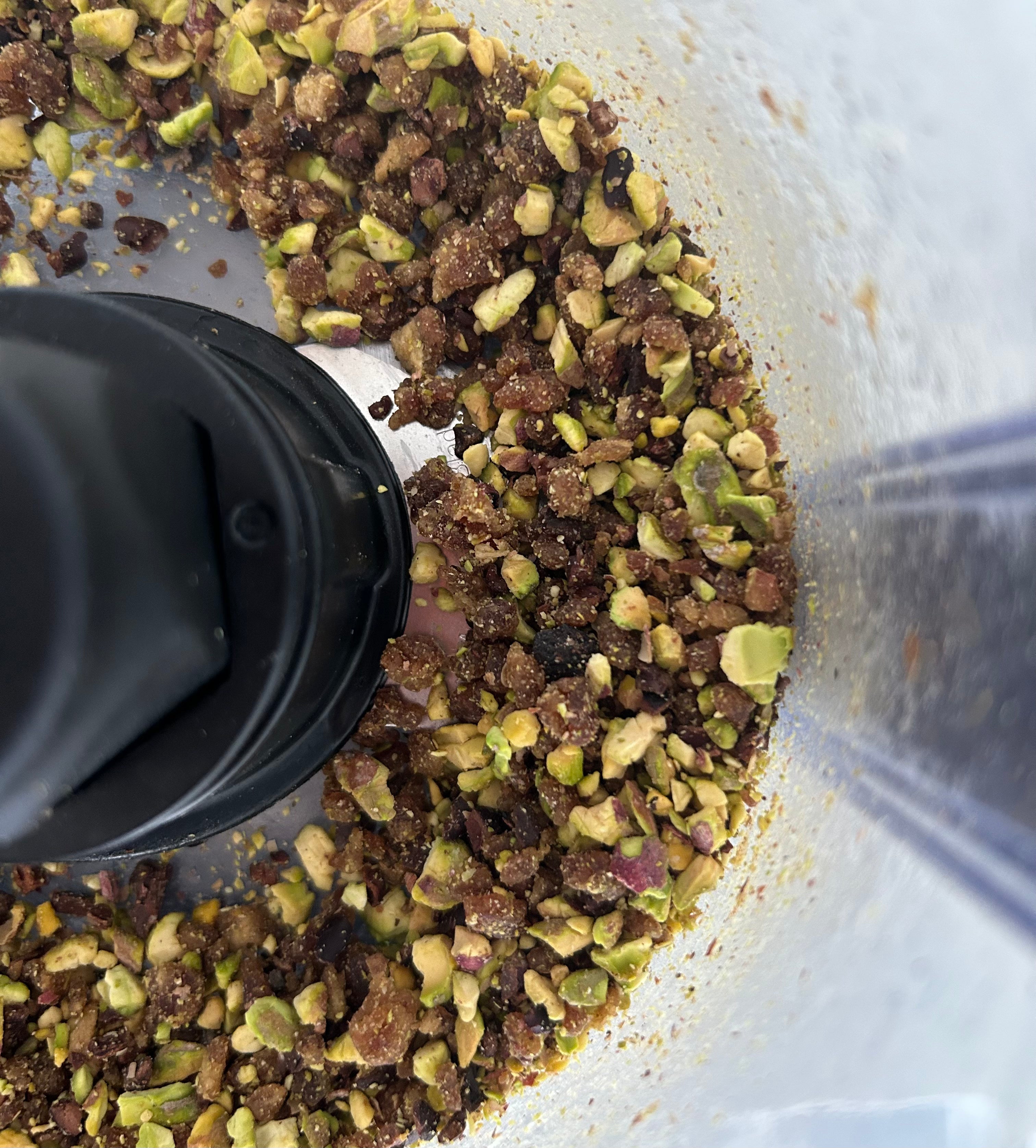 - ADD pistachios and cacao nibs, to the food processor. Pulse a few times, until they are chopped. Do not over process them, you want them to be crunchy.