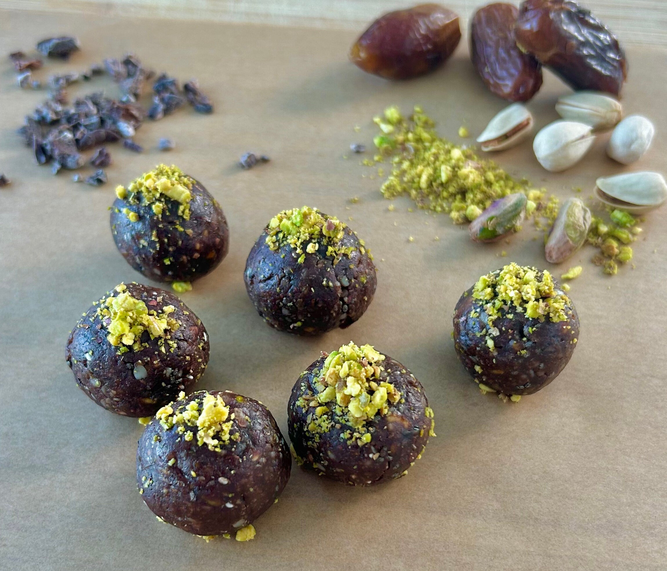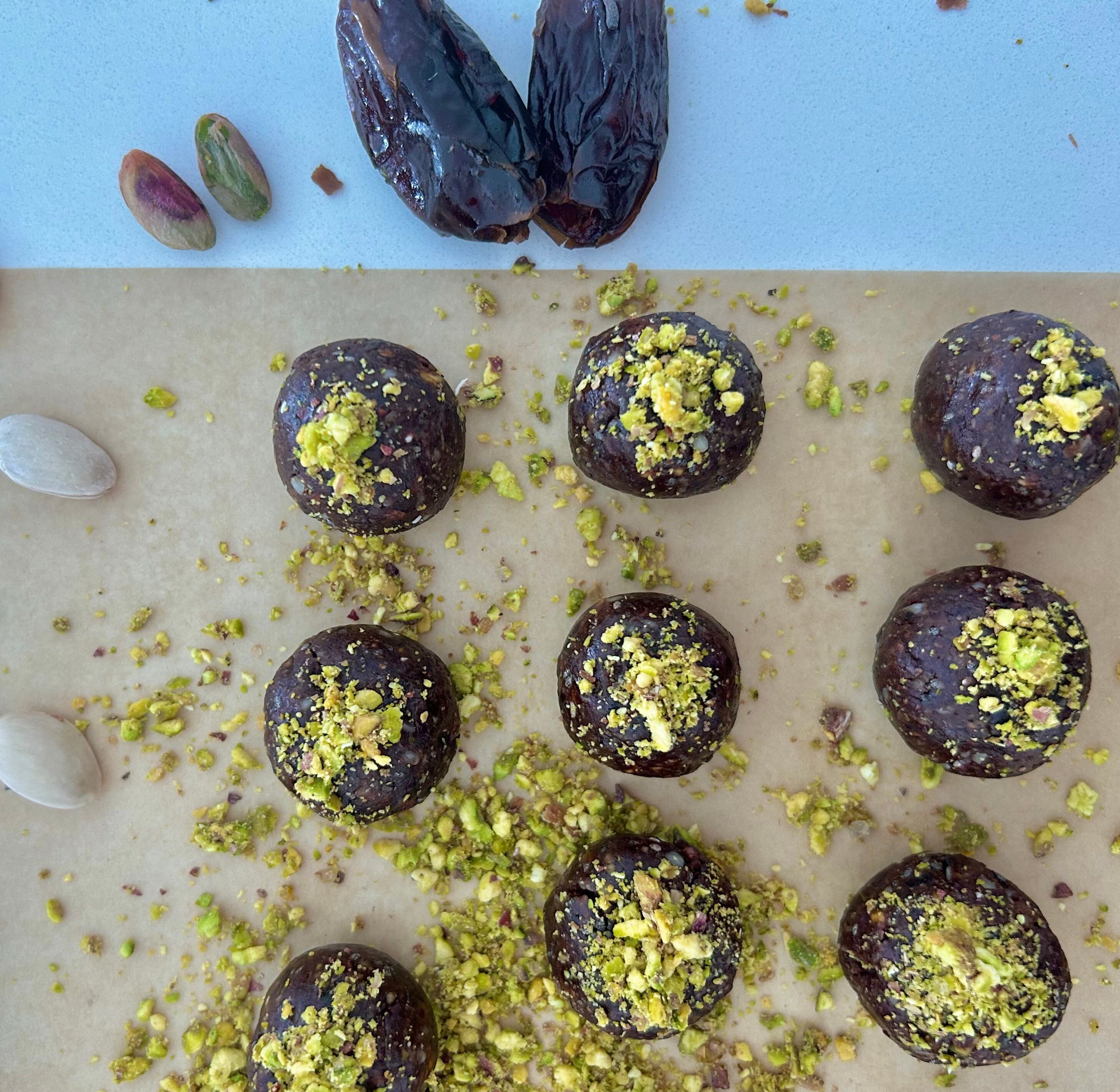 - MAKE small balls, using your hands and top each of them with crushed pistachios.