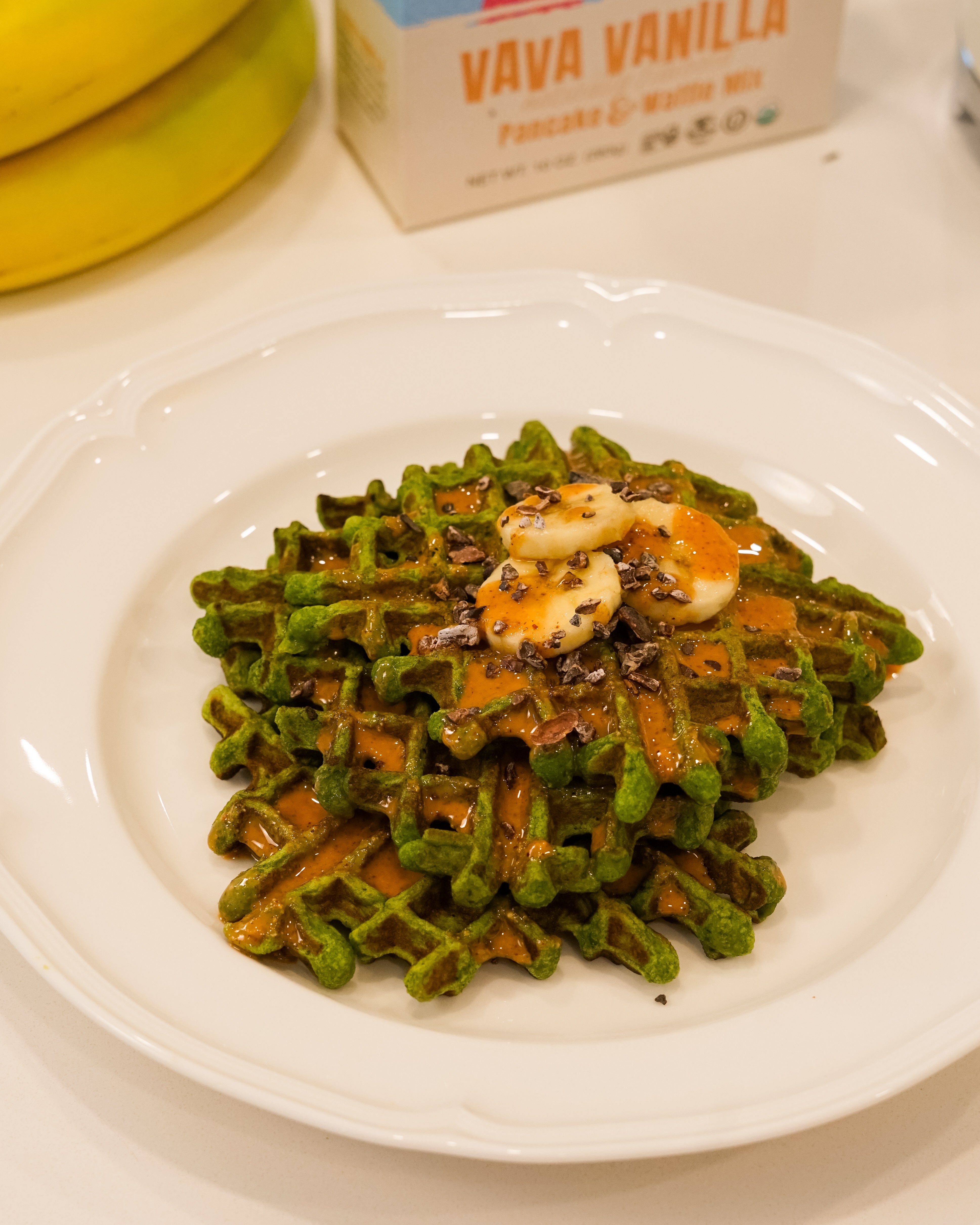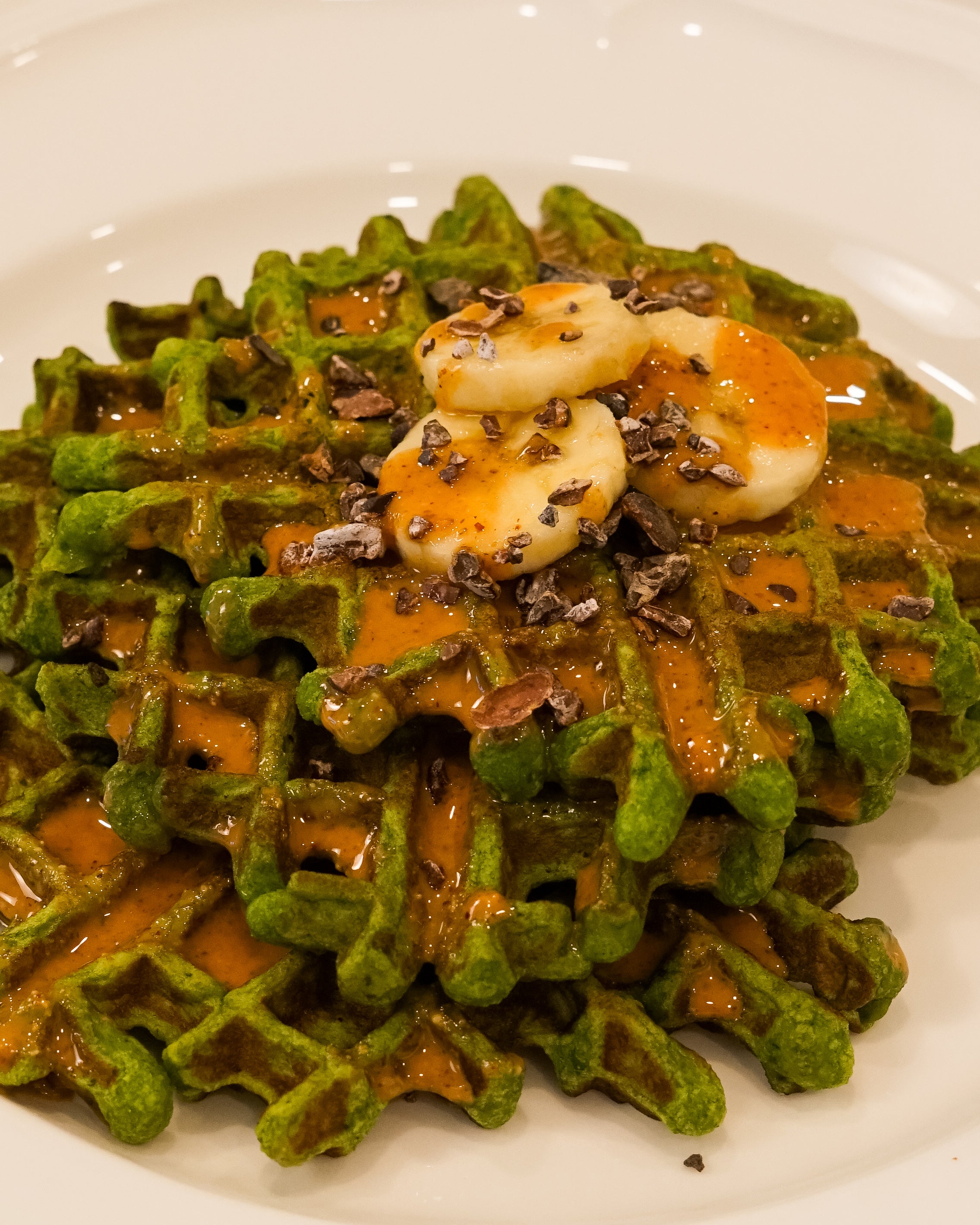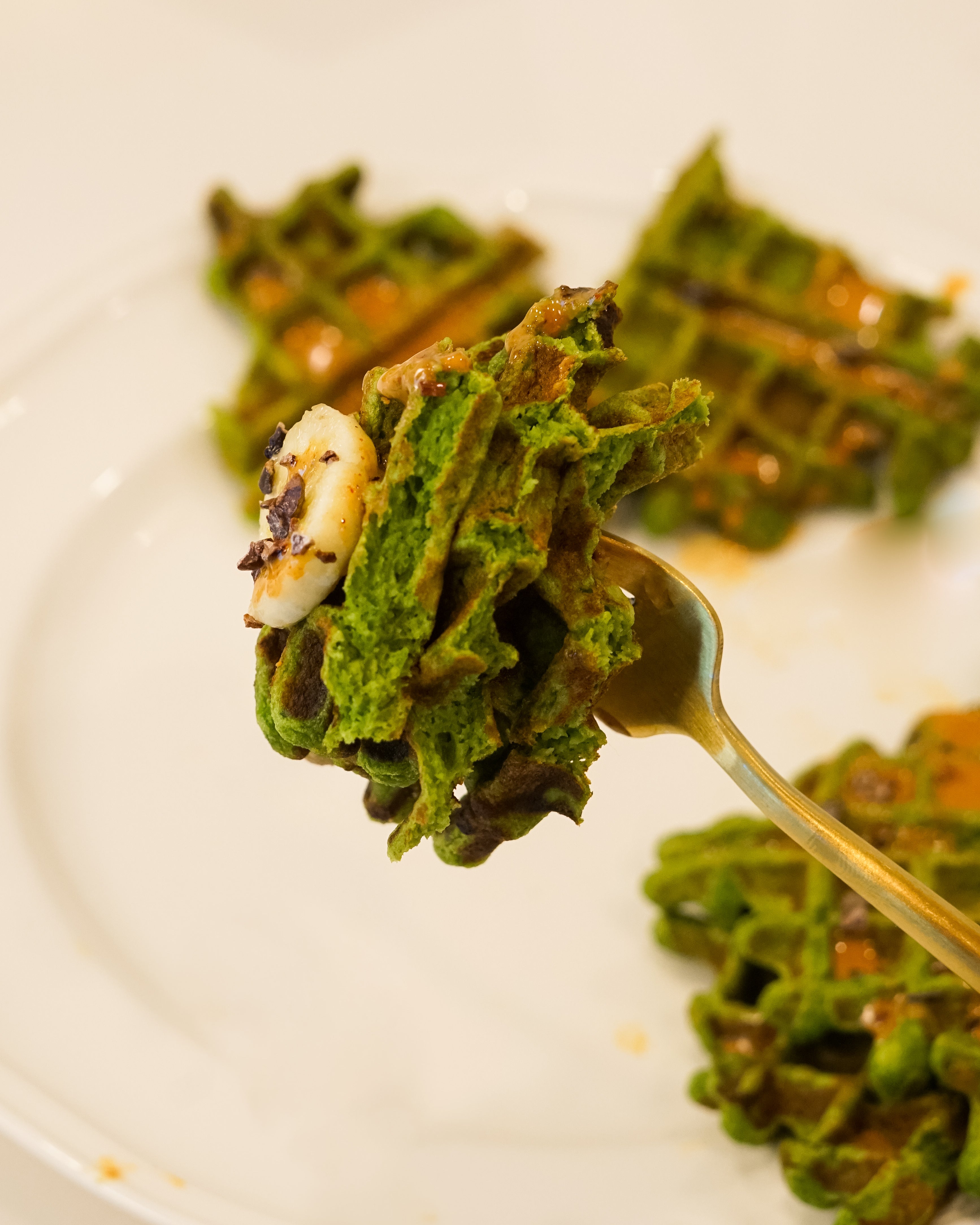 These protein waffles are easily mixed in your blender and they are veggie-loaded with spinach; a great way to wiggle veggies in at breakfast and start your morning right, we tons of energy and nutrients!