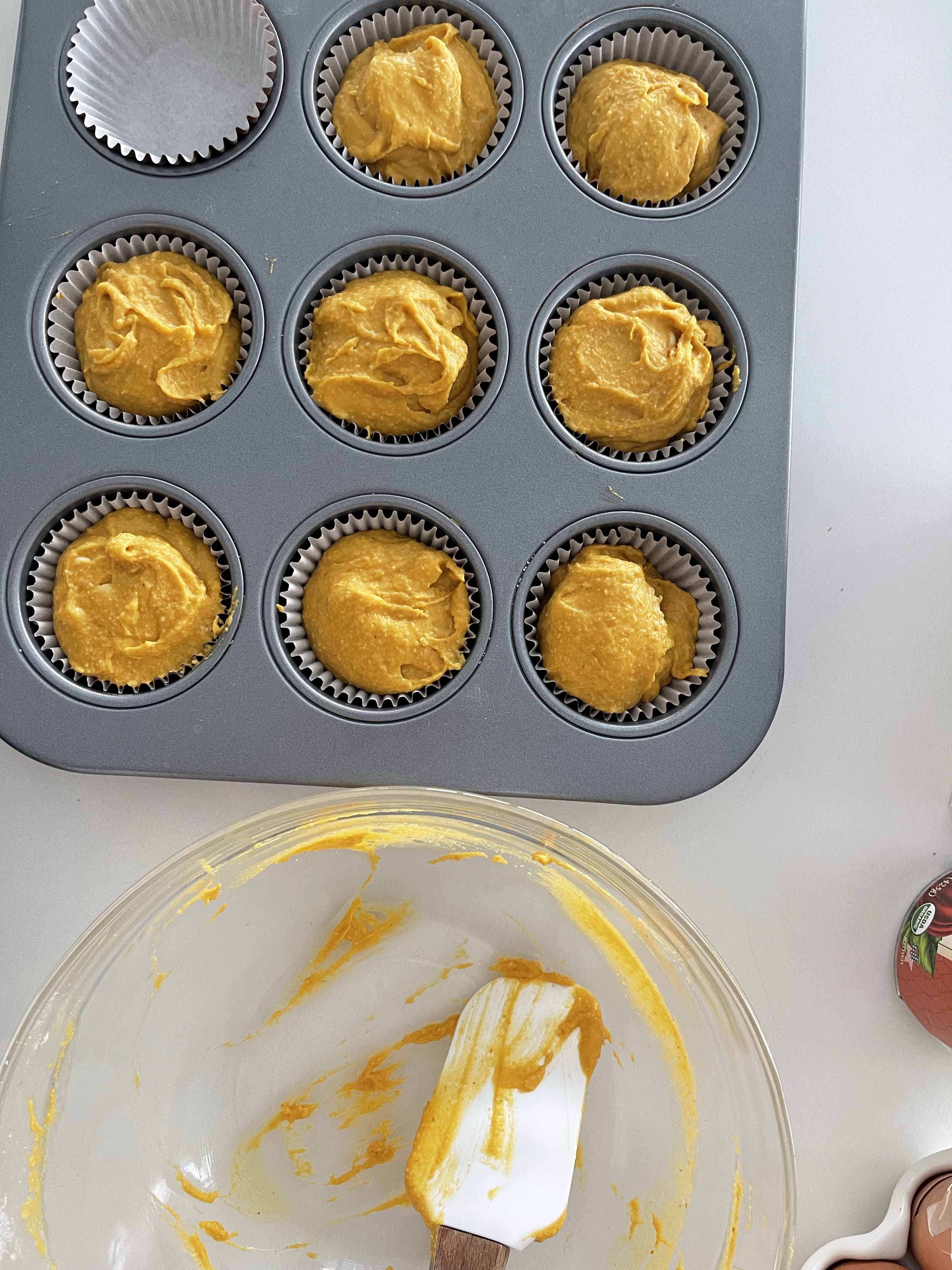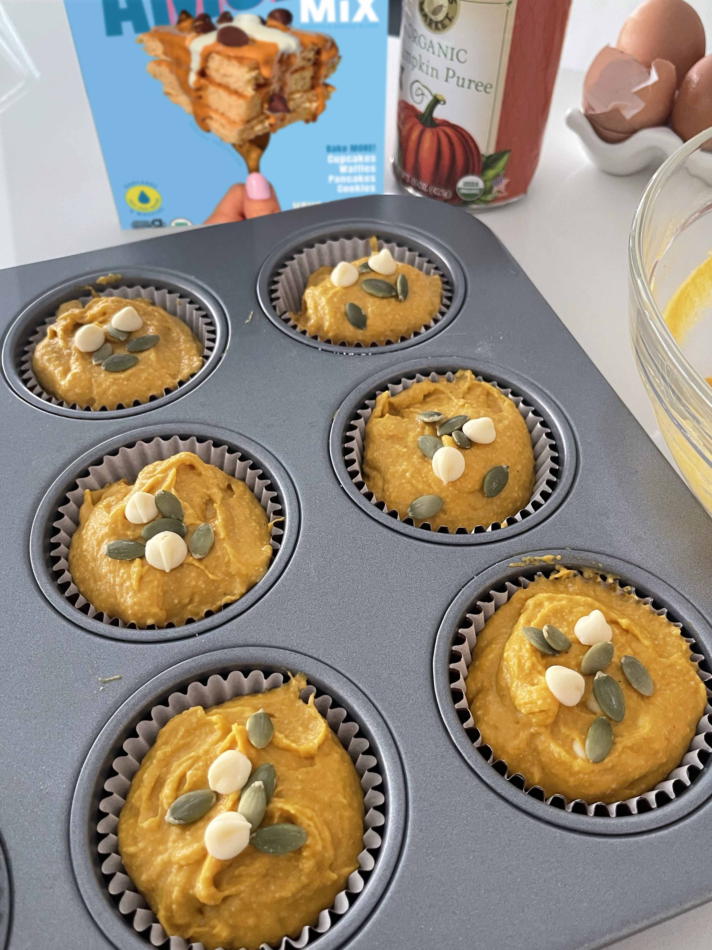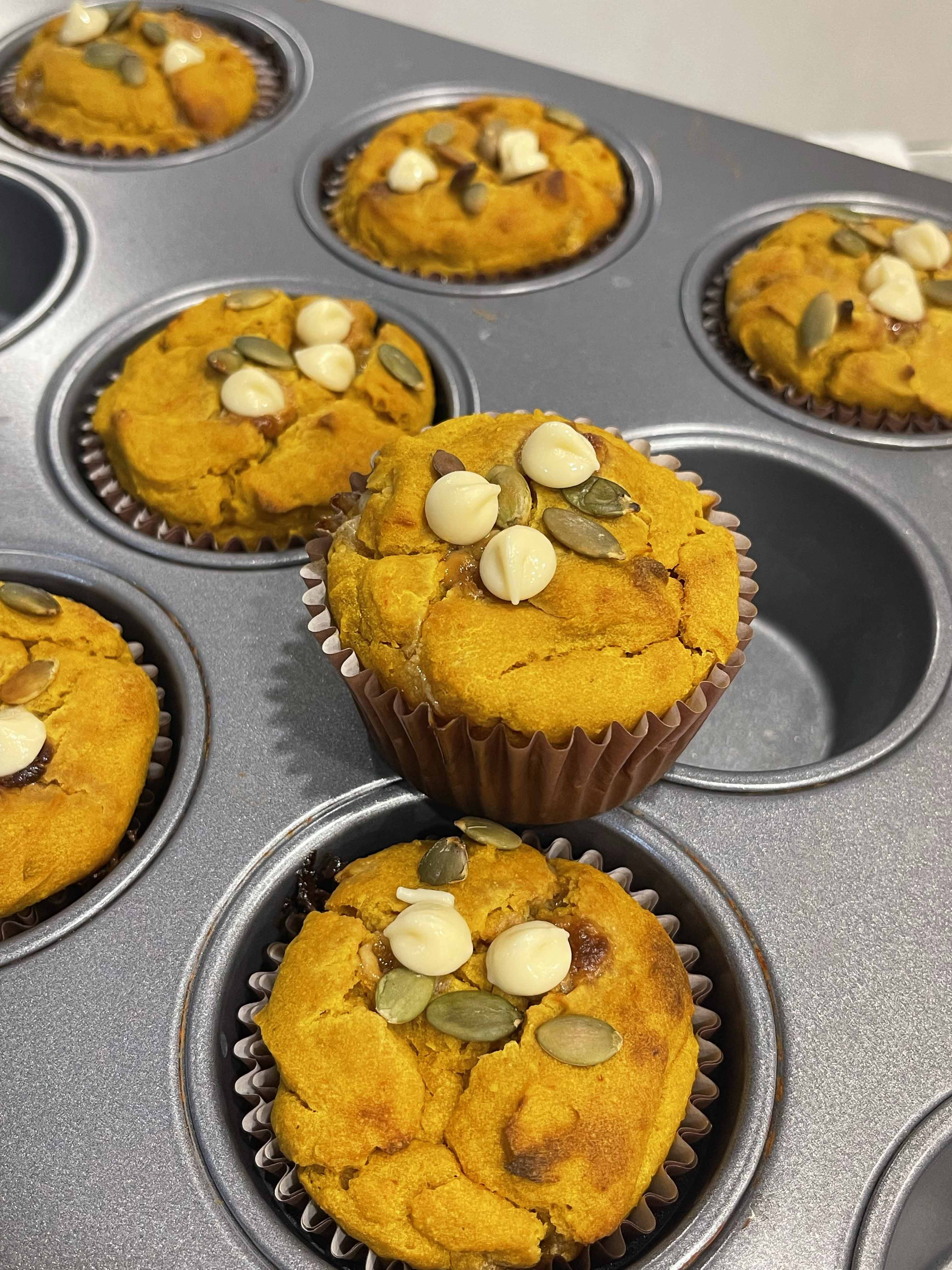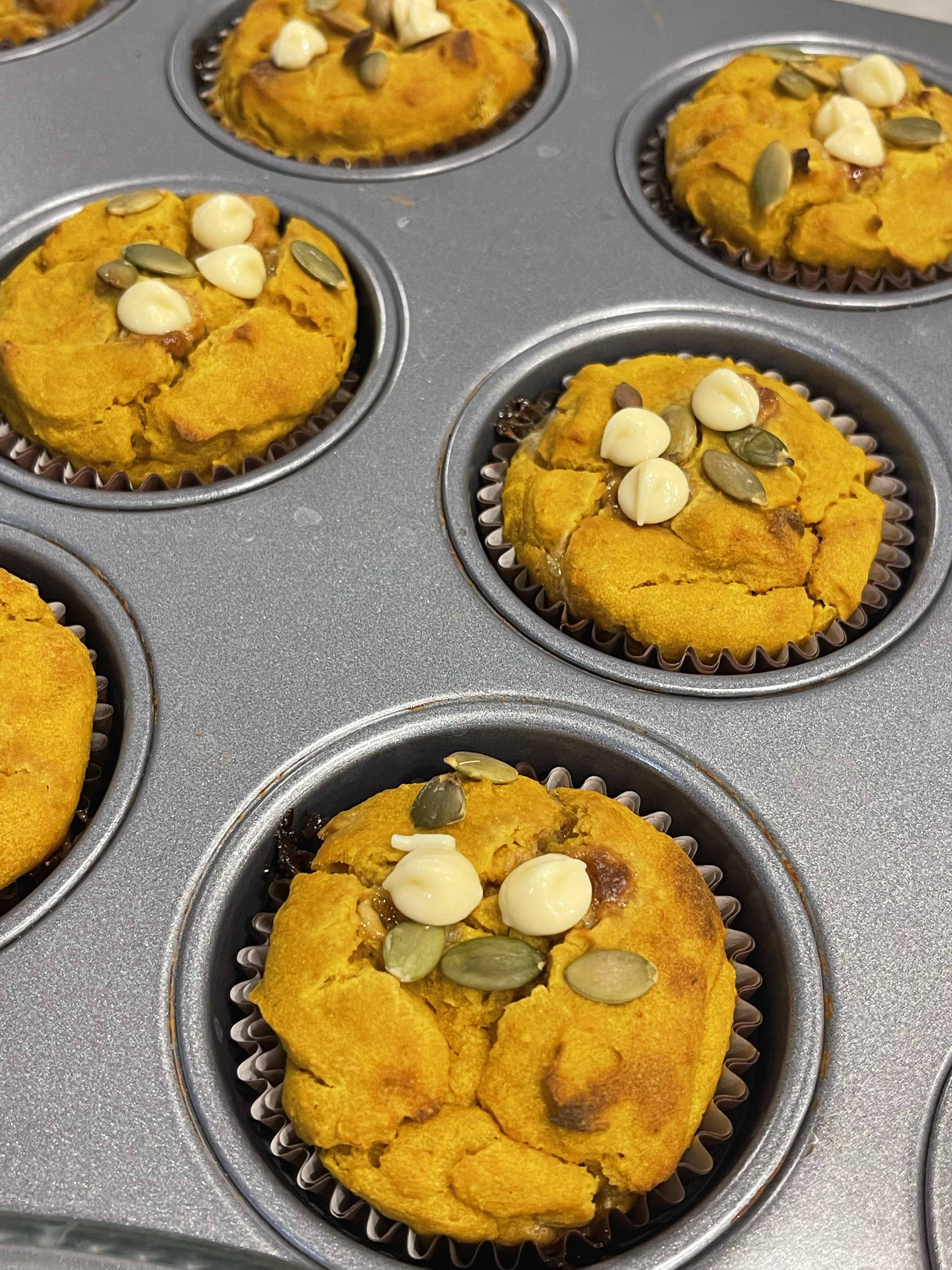 - TOP each muffin with a few pumpkin seeds, and bake for about 25 minutes, until a tooth pick inserted in the middle comes out clean.