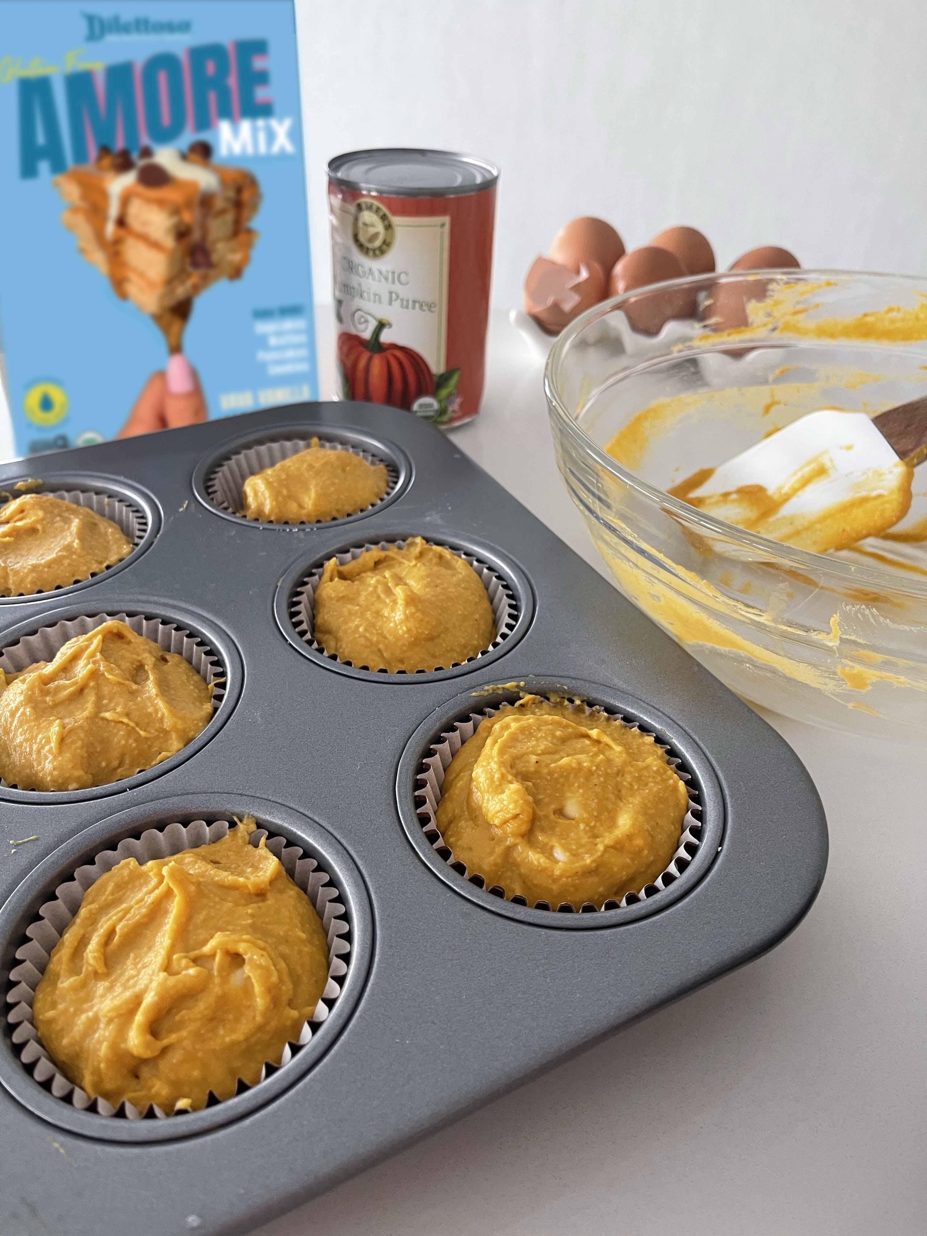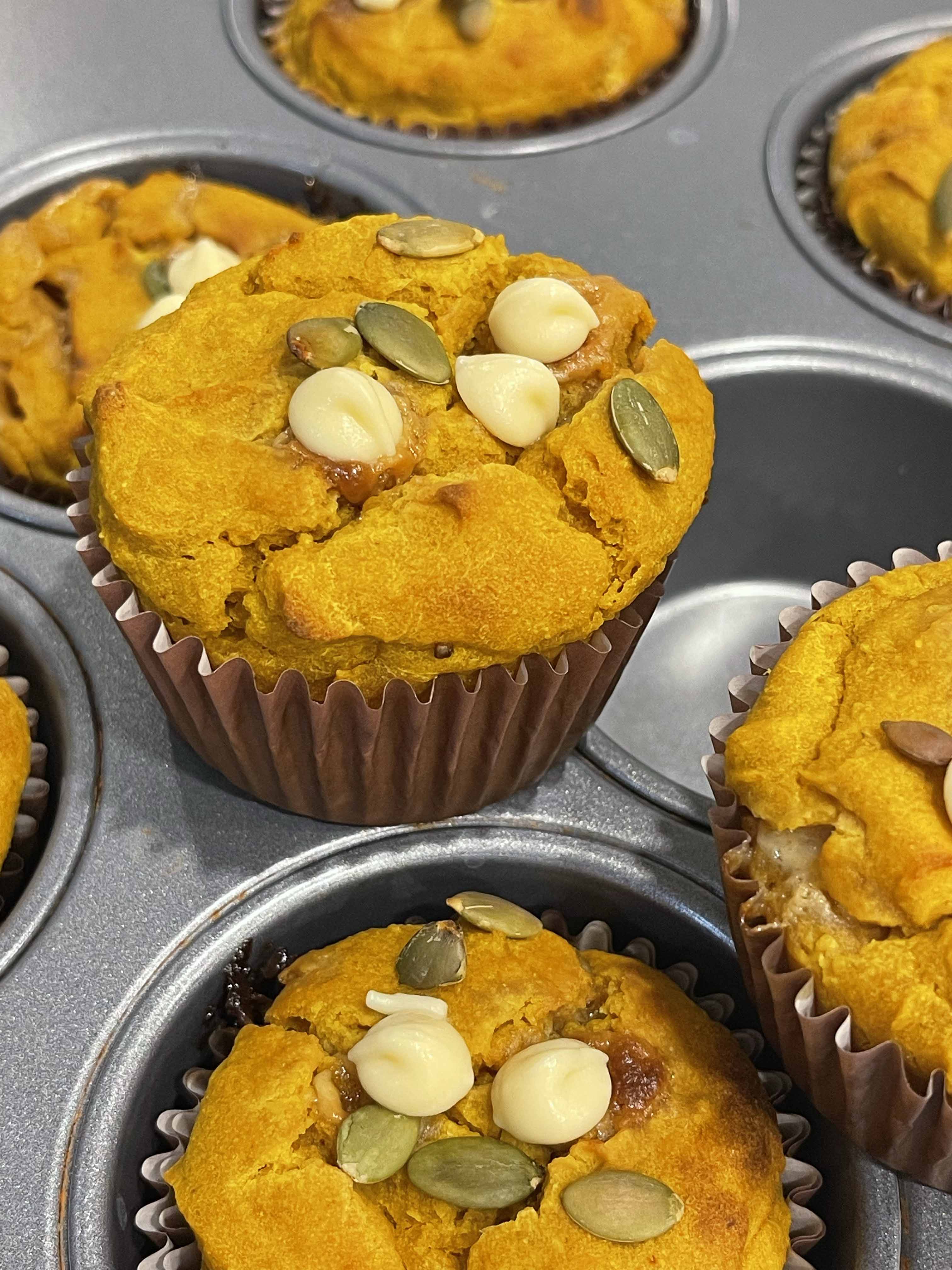 These Pumpkin White Chocolate Chip Muffins are a celebration of simple, quality ingredients. Made with Dilettoso's Vava Vanilla AMORE Mix and pureed pumpkin, they’re soft, spiced, and perfectly moist. White chocolate chips add a creamy sweetness, while pumpkin seeds provide a rustic finish.