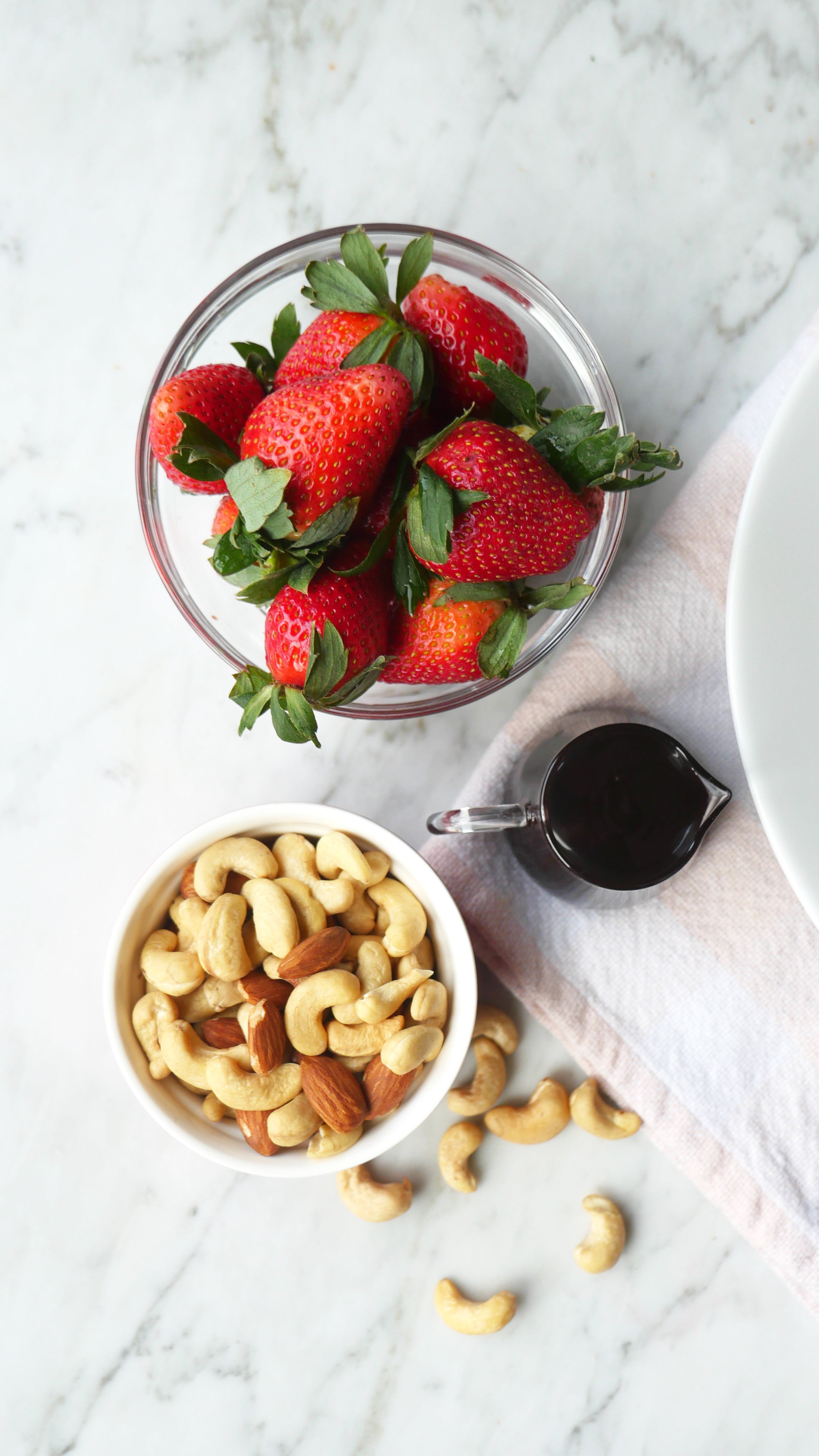 - PREPARE the cheesecake filling by adding raw cashews, vanilla yogurt, milk of choice, pureed strawberries, maple syrup, and lemon zest, to a high-speed blender. Blend on highest speed until mixture is thick and creamy, about 45-60 seconds.