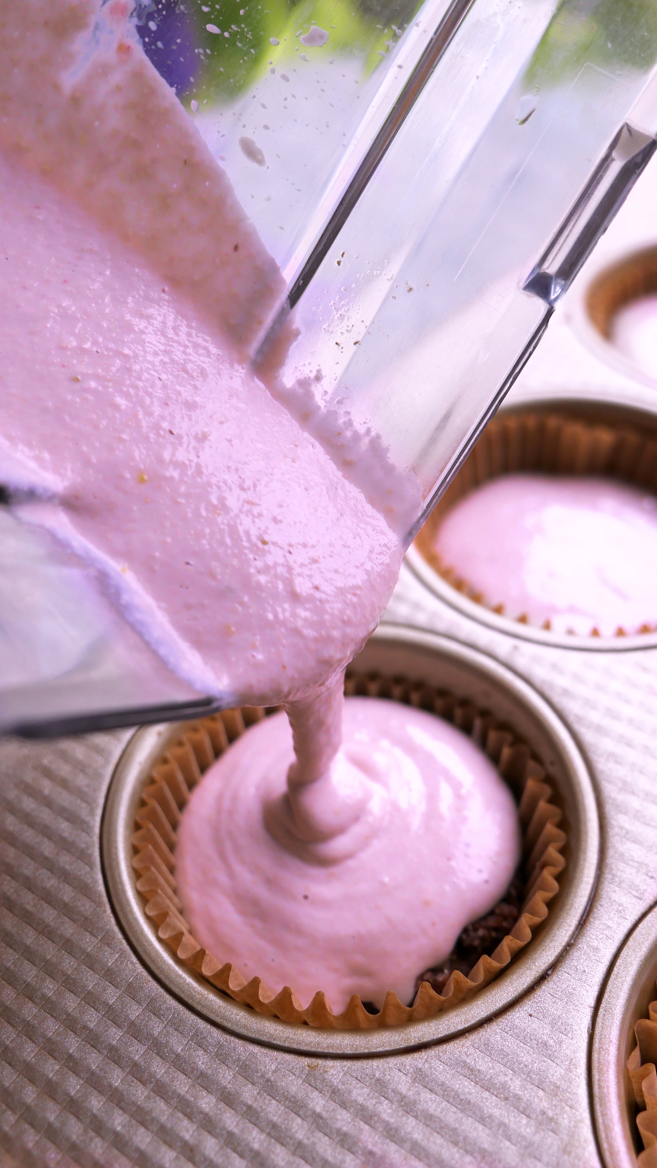 - REMOVE cheesecake crusts from the freezer. Pour cheesecake filling overtop, filling about ¾ of the muffin tin.