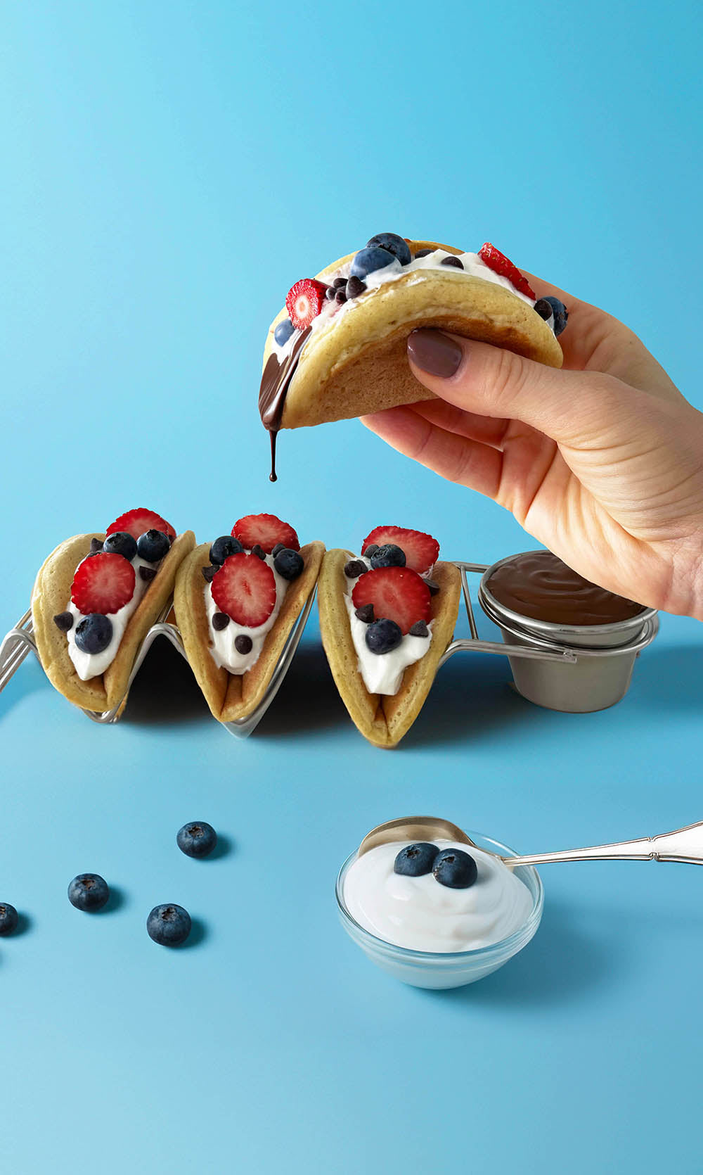 Indulge in the delights of these pillowy pancake tacos drizzled with rich, velvety chocolate syrup cascading over the folds. Accented by crisp coconut and succulent fruits, this exquisite combination offers an unforgettable flavor journey.