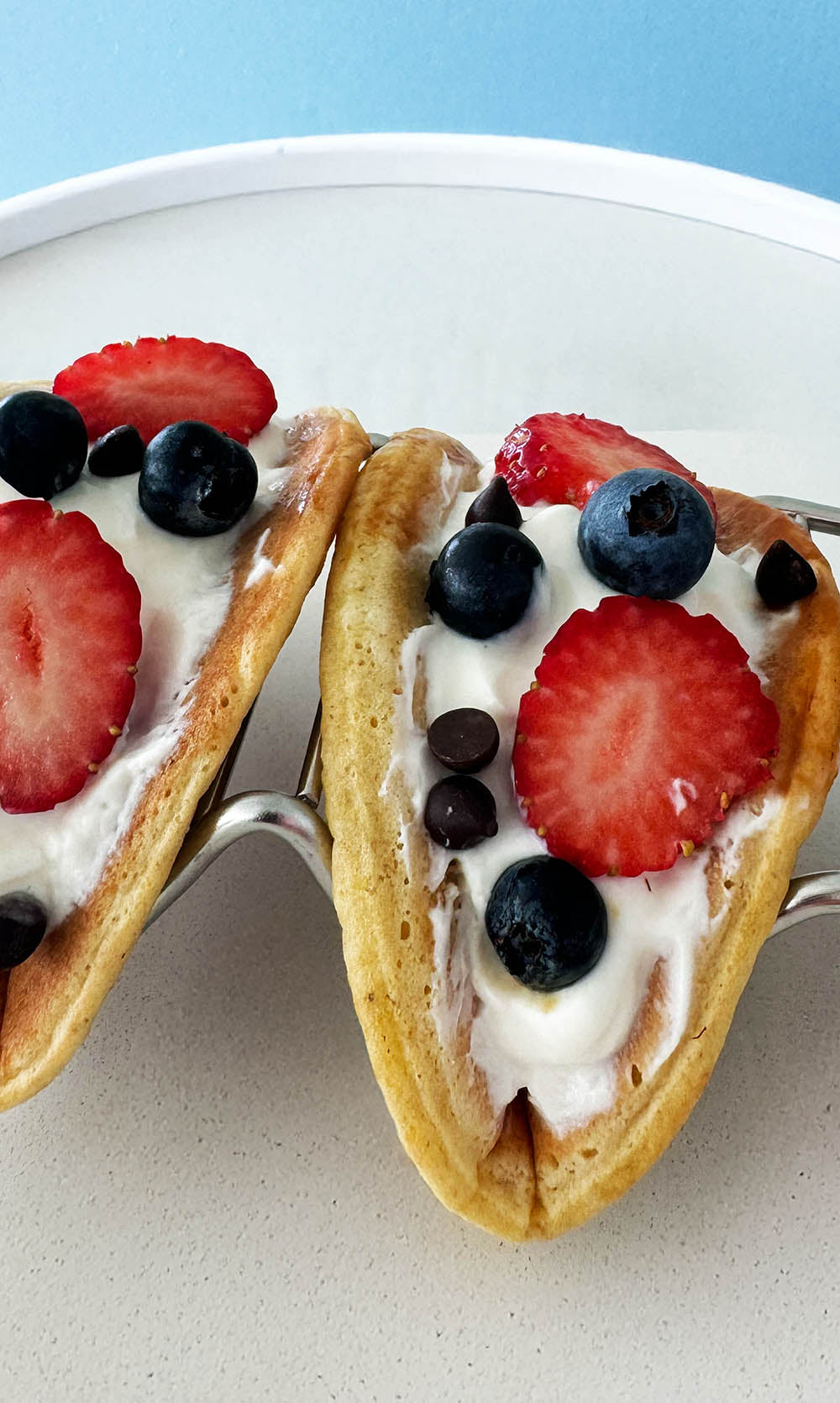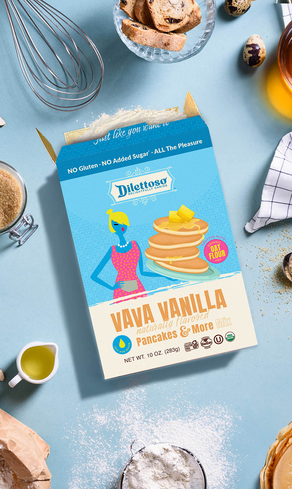- MIX Dilettoso Vava Vanilla pancake & waffle mix according to package instructions with either water or milk (we used unsweetened vanilla almond milk).