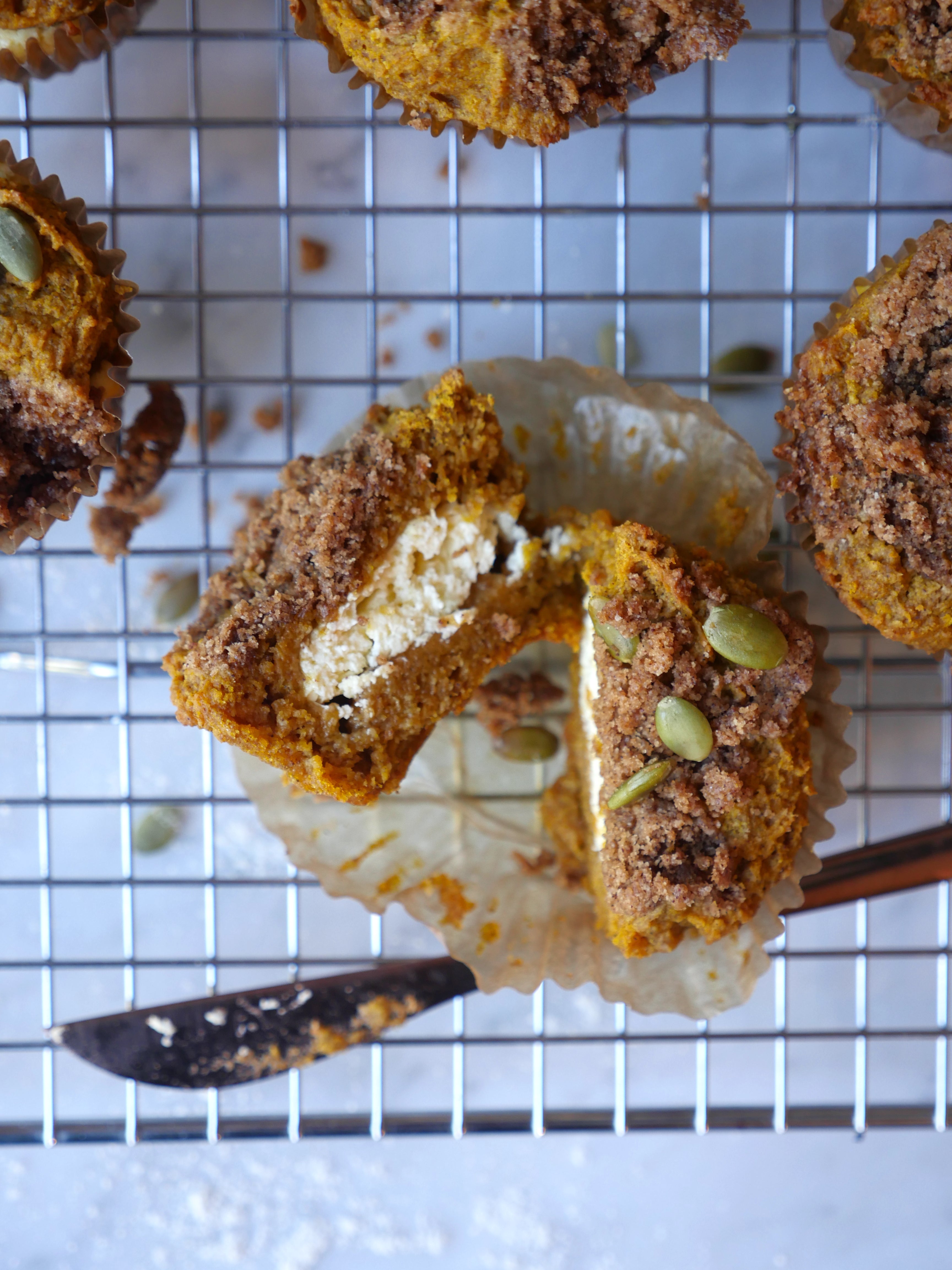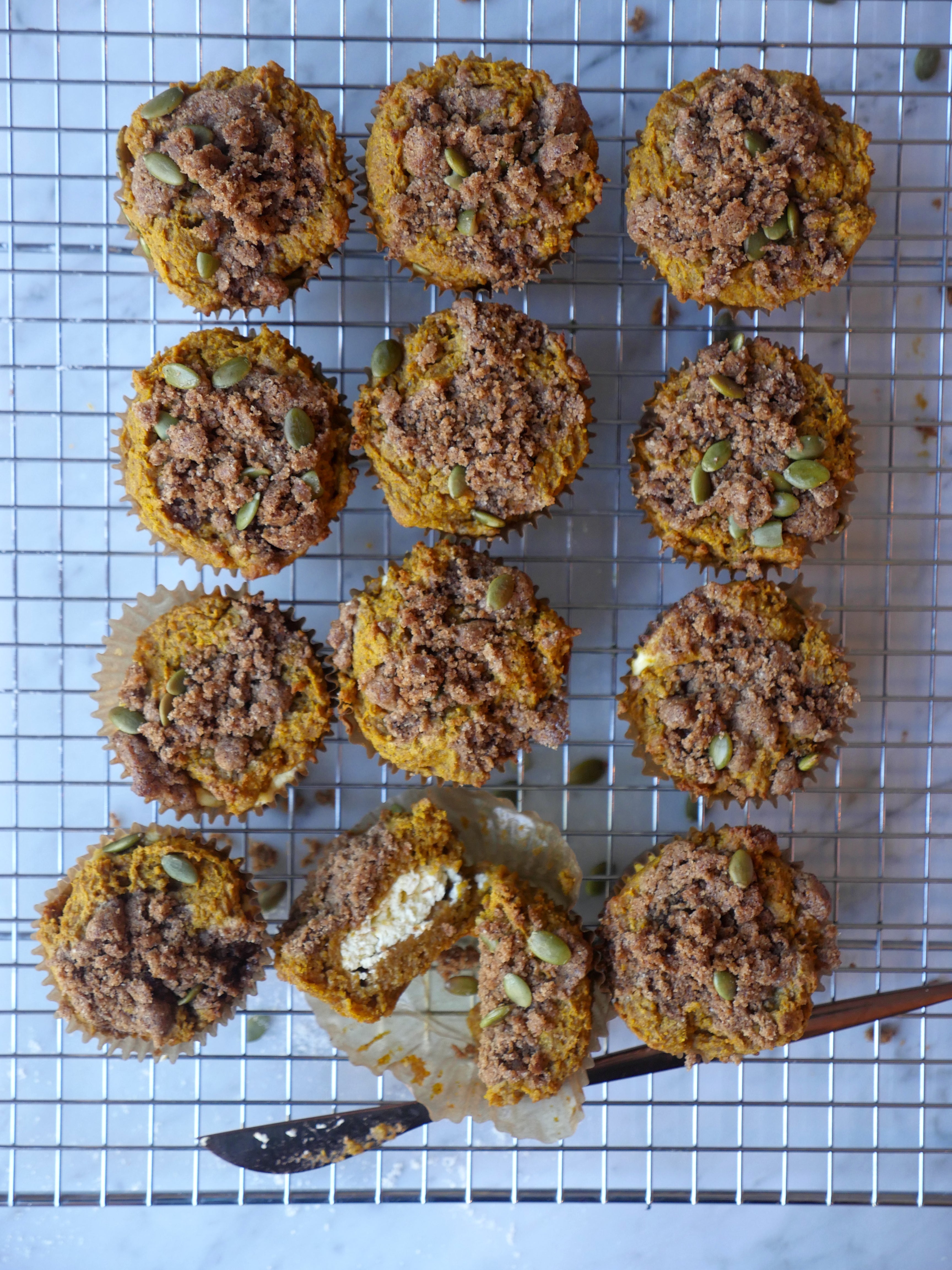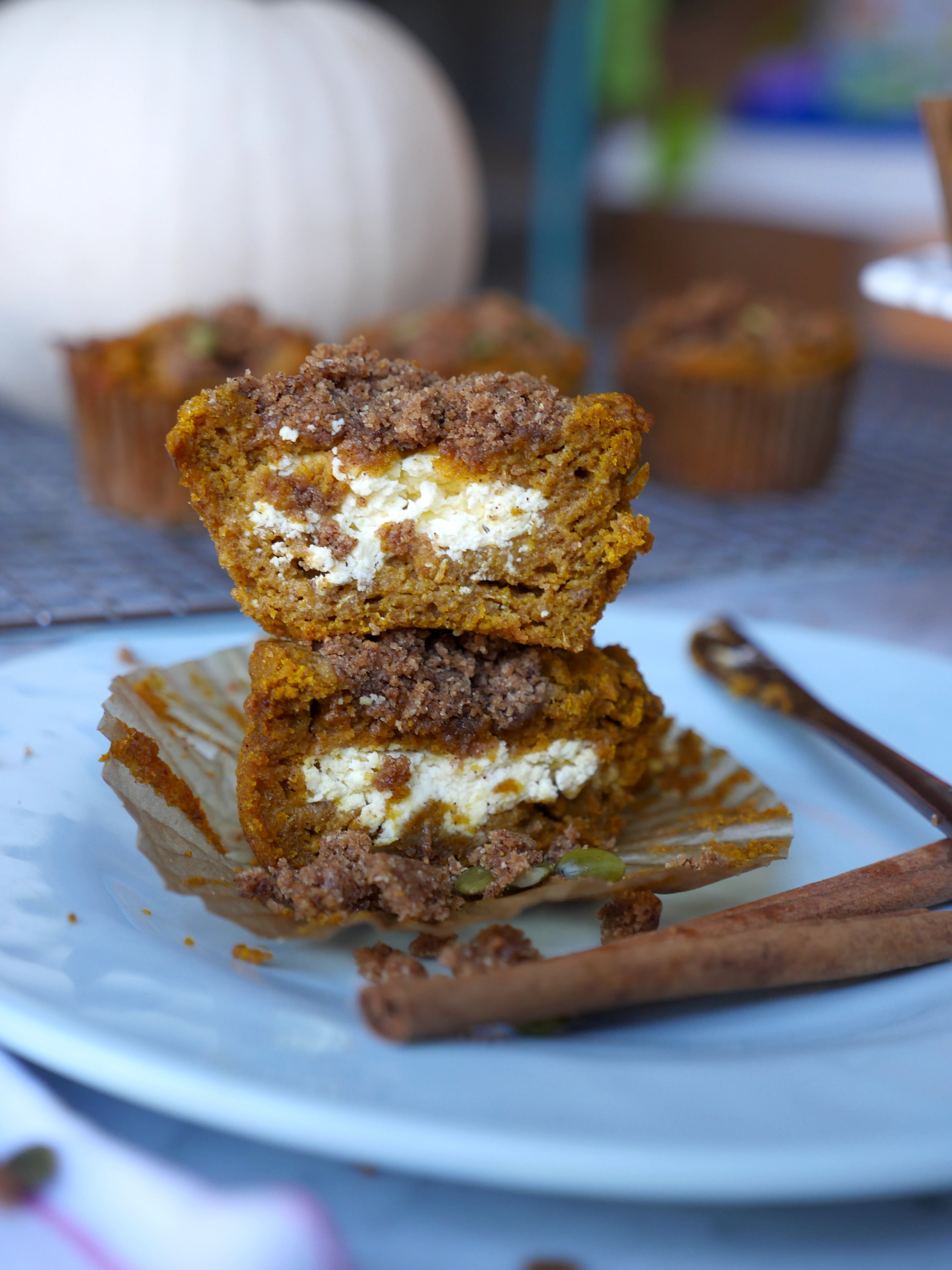 - USE an ice-cream scoop to scoop the muffin batter into the muffin liner so that they are about 1/3 of the way filled. Spoon about 1 tablespoon of the cream cheese on top and then cover with remaining pumpkin batter (it's ok if the batter doesn't completely cover the cream cheese batter).