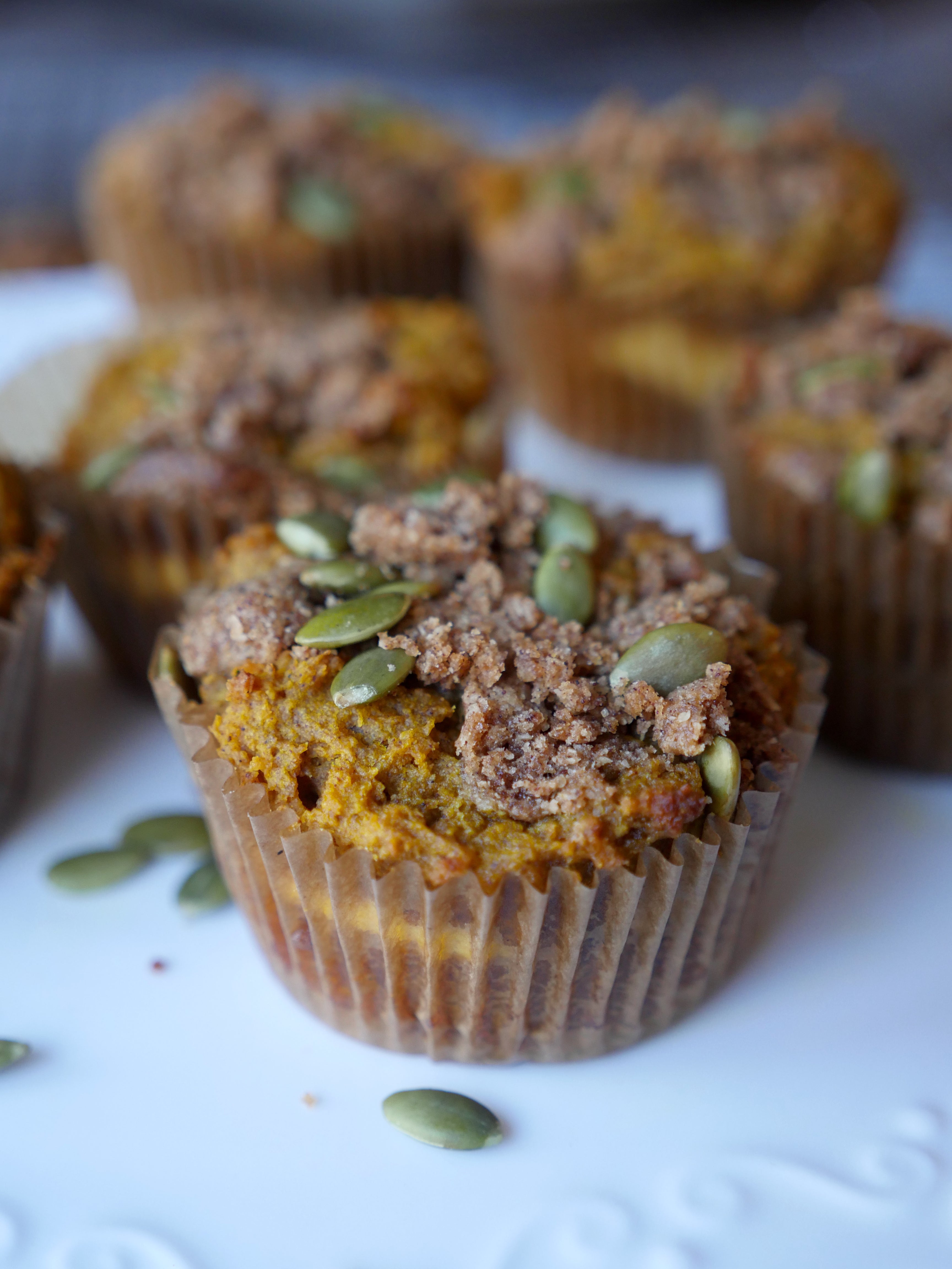 - SPRINKLE the crumb topping and pumpkin seeds if desired over each. Bake for 23-25 minutes (checking at 23 minutes). Let cool and enjoy!