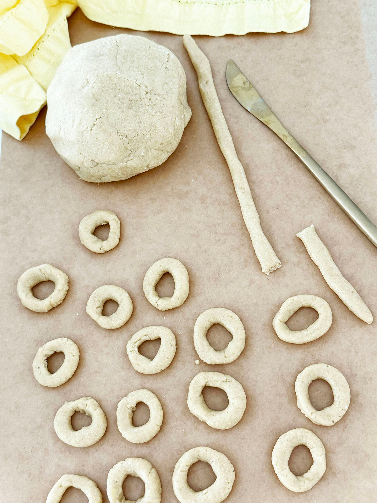 - DIVIDE the dough into 12 pieces. Roll each piece into a small rope (about 6 inches long) and shape it into a ring, pinching the ends together.