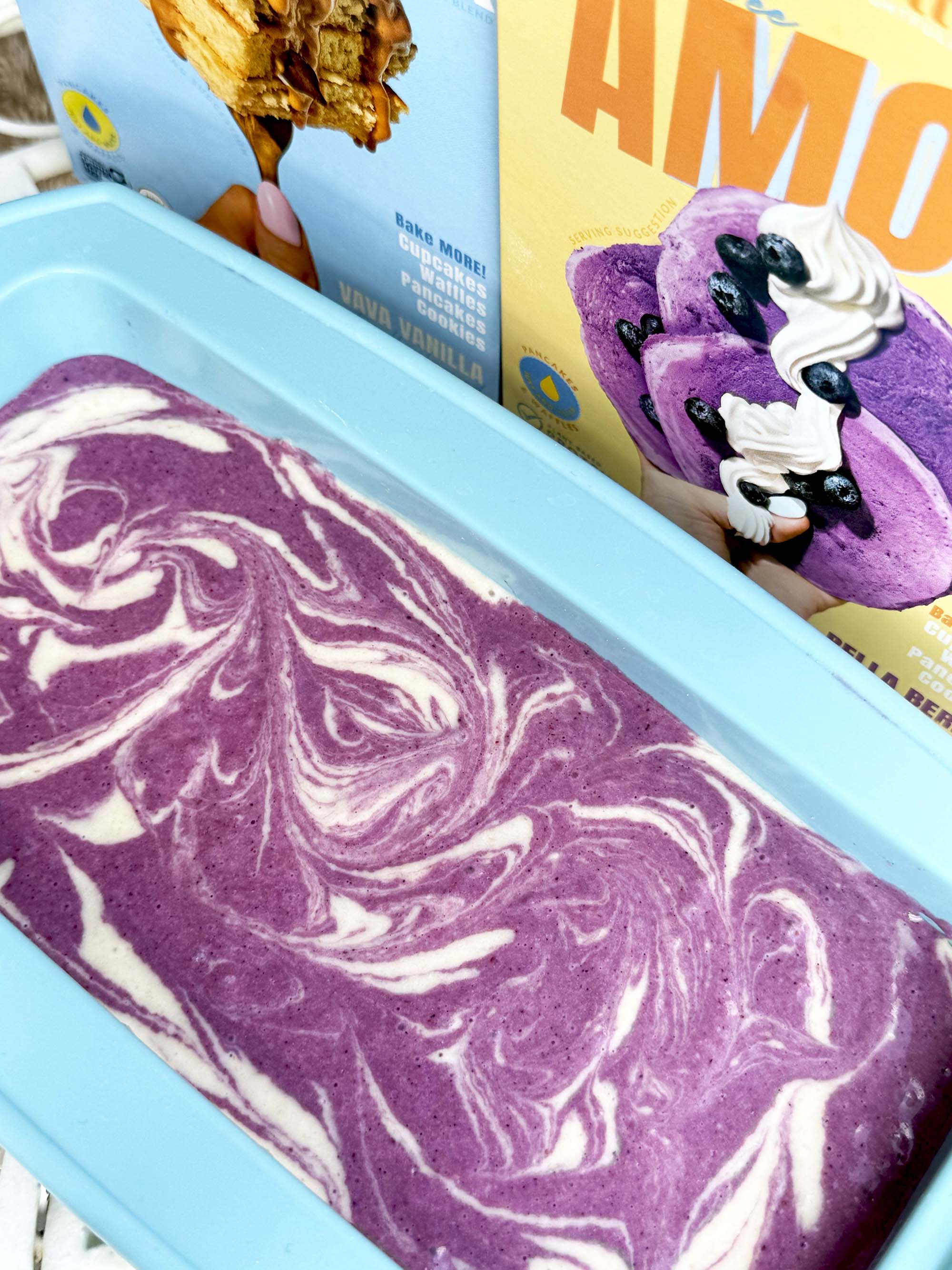 - SCOOP dollops of berry batter on top of the vanilla layer using a gelato scoop (or large spoon).